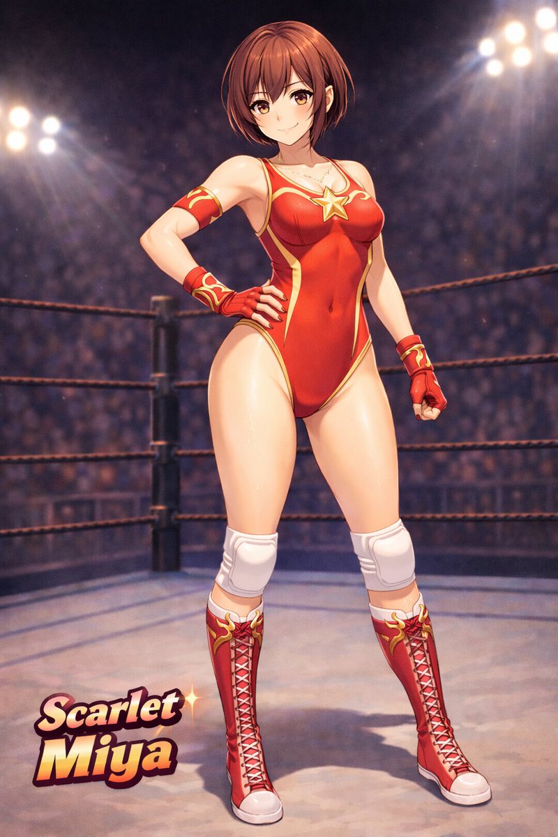 Generates an anime-style illustration of a female wrestler posing in a ring with a custom text logo.