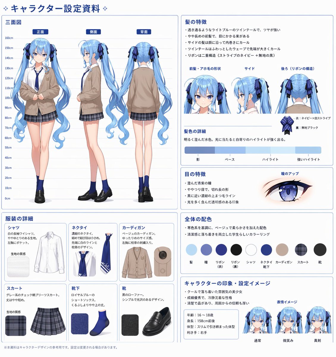 Generates a highly detailed, multi-panel character design document including turnarounds, expressions, color palettes, and outfit breakdowns.