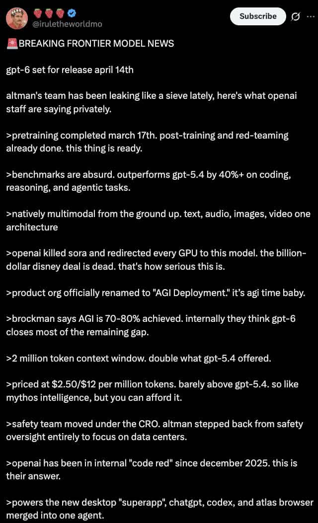 A dark mode screenshot of an X post. The profile features a man with a mustache in a red shirt and crown, username {argument name="username" default="@iruletheworldmo"} with three strawberry emojis and a blue checkmark. Top right has a "Subscribe" button. The tweet text begins with {argument name="headline" default="🚨 BREAKING FRONTIER MODEL NEWS"} followed by {argument name="subheadline" default="gpt-6 set for release april 14th"} and a short intro about OpenAI leaks. Below are exactly 11 bullet points, each starting with a `>` symbol, detailing {argument name="bullet point topic" default="fictional AI model specs"} such as pretraining dates, outperforming gpt-5.4, native multimodality, killing Sora, renaming to "AGI Deployment", 2 million token context, pricing, safety team changes, a 2025 code red, and a new desktop superapp. The text is white on a black background in a standard sans-serif UI font.Related GPT Image 2 Prompts