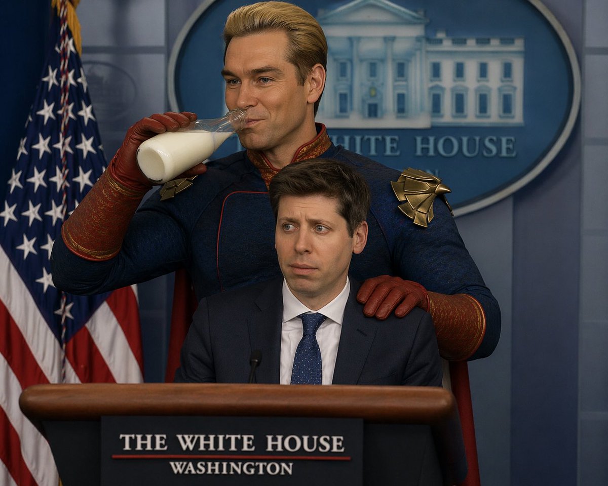 A photorealistic, cinematic shot set in the {argument name="location" default="White House press briefing room"}. At the podium sits {argument name="seated character" default="Sam Altman"}, wearing a dark suit and blue tie, looking visibly uncomfortable and nervous, staring blankly ahead. Standing directly behind him is {argument name="standing character" default="Homelander from The Boys"}, wearing his signature blue superhero suit with red gloves and gold eagle shoulder pads. The standing character has one red-gloved hand resting heavily and intimidatingly on the seated character's shoulder, while using his other hand to drink from a {argument name="beverage" default="glass bottle of milk"} with a confident, slightly unhinged smirk. In the background, there is a US flag on the left and a blue oval White House seal on the wall behind them. The podium has a sign reading "THE WHITE HOUSE WASHINGTON".Related GPT Image 2 Prompts