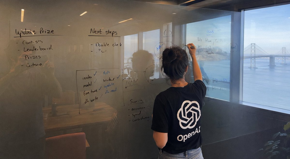 A wide image shot on {argument name="camera" default="iPhone"} of a glass whiteboard, in a room overlooking {argument name="landmark" default="the Bay Bridge"}. The field of view shows {argument name="subject" default="a woman writing"}, sporting a tshirt with a large OpenAl logo. The handwriting looks natural and a bit messy, and we see the photographer's reflection.Related GPT Image 2 Prompts