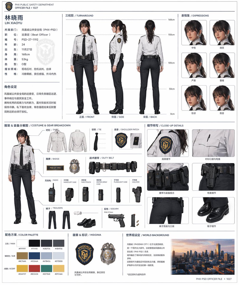 Based on this character and background, please create a character sheet like an official setting document. ・Includes front, side, and back three-views ・Add character expression changes ・Display breakdown of clothing or equipment parts ・Add color palette ・Include a brief description of the world view ・Overall neat layout (white background, diagram style) High resolution, professional concept art style
