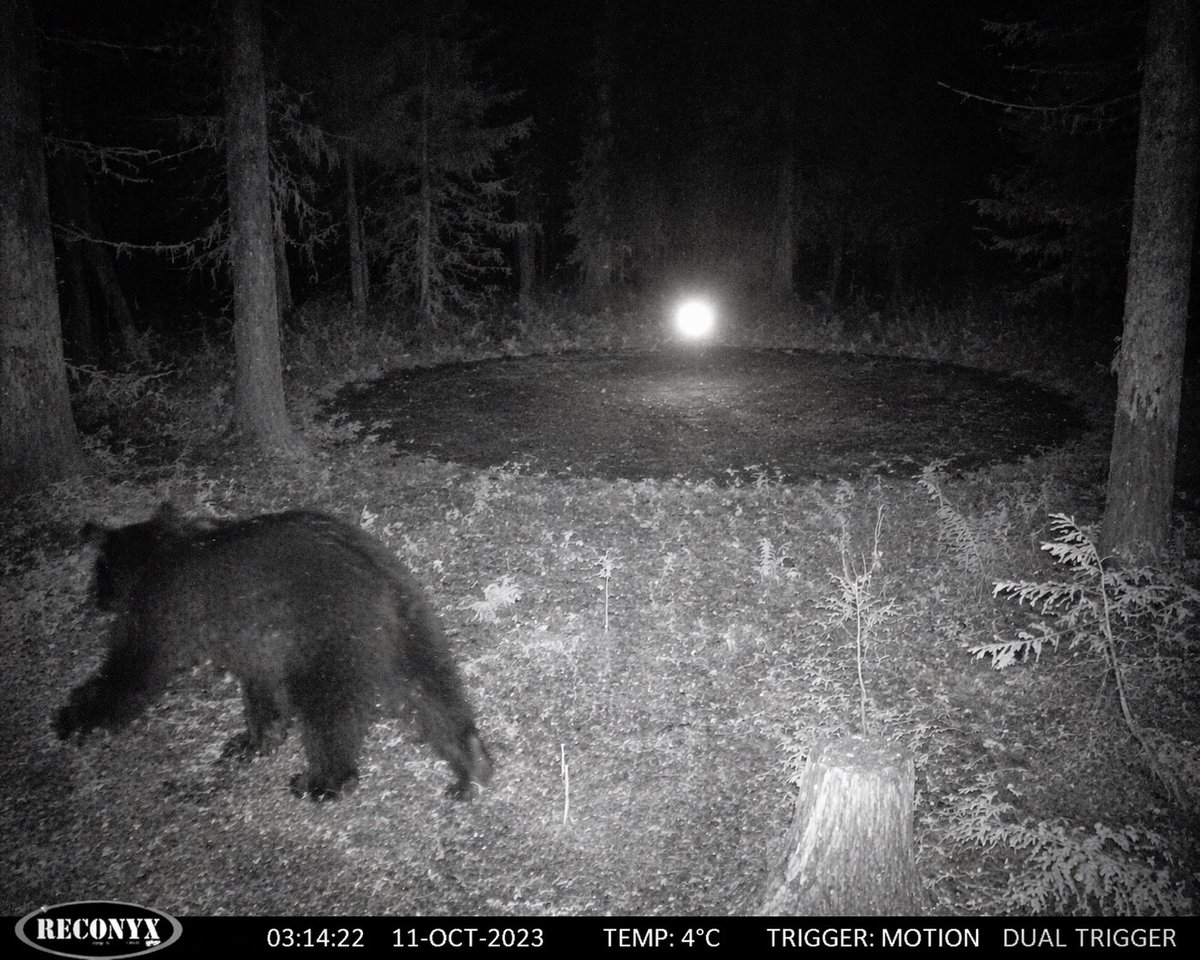 A black and white infrared trail camera photo taken at night in a dense coniferous forest. In the foreground on the left, a large black bear is walking past, appearing slightly motion-blurred. In the center of the clearing, there is a perfectly circular, dark, barren patch of dirt on the forest floor. Hovering just above the ground at the far edge of this dark circle is a bright, glowing, spherical orb of light. The image features a grainy night vision aesthetic with visible underbrush, pine tree trunks, and a tree stump in the bottom right corner. A black data bar runs across the bottom edge containing white text: on the far left, an oval logo reading "{argument name="camera brand" default="RECONYX"}", followed by the timestamp "{argument name="timestamp" default="03:14:22 11-OCT-2023"}", then "{argument name="temperature" default="TEMP: 4°C"}", and on the far right, "{argument name="trigger info" default="TRIGGER: MOTION DUAL TRIGGER"}".Related GPT Image 2 Prompts