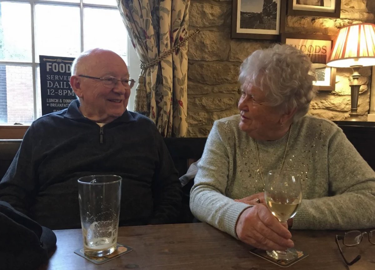 Generates a highly realistic portrait of an older couple enjoying drinks and snacks at a warmly lit pub table.