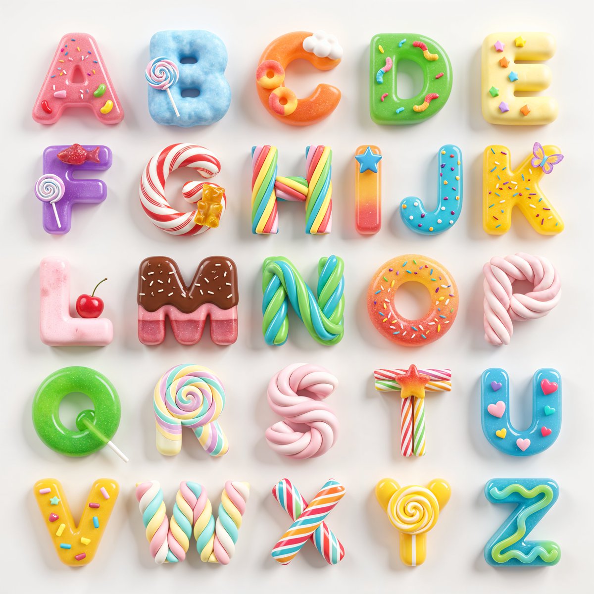 A whimsical prompt for creating cute, candy-themed 3D letters from A to Z with soft textures and pastel colors.