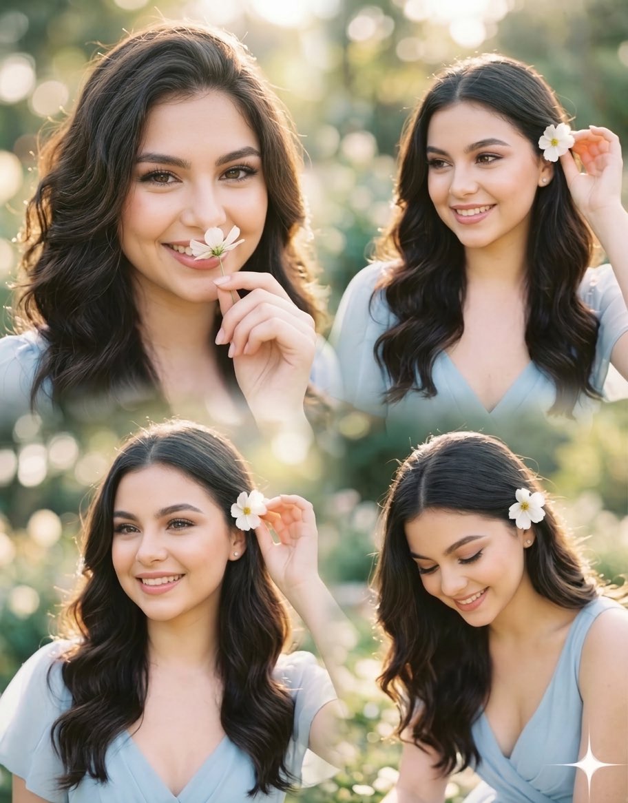 Using the uploaded photo as a starting point, A photorealistic 4-panel collage portrait of a smiling young woman, with long dark wavy hair in a light blue v-neck blouse. In the top-left, she holds a white flower to her nose; in the other panels, it is tucked behind her ear. The background is a softly blurred garden with warm greens and heavy bokeh. The lighting is soft golden hour natural sunlight. The color palette is dominated by pastel blue, white, and earthy tones. The mood is cheerful and serene. 4K resolution, highly detailed portrait photography.