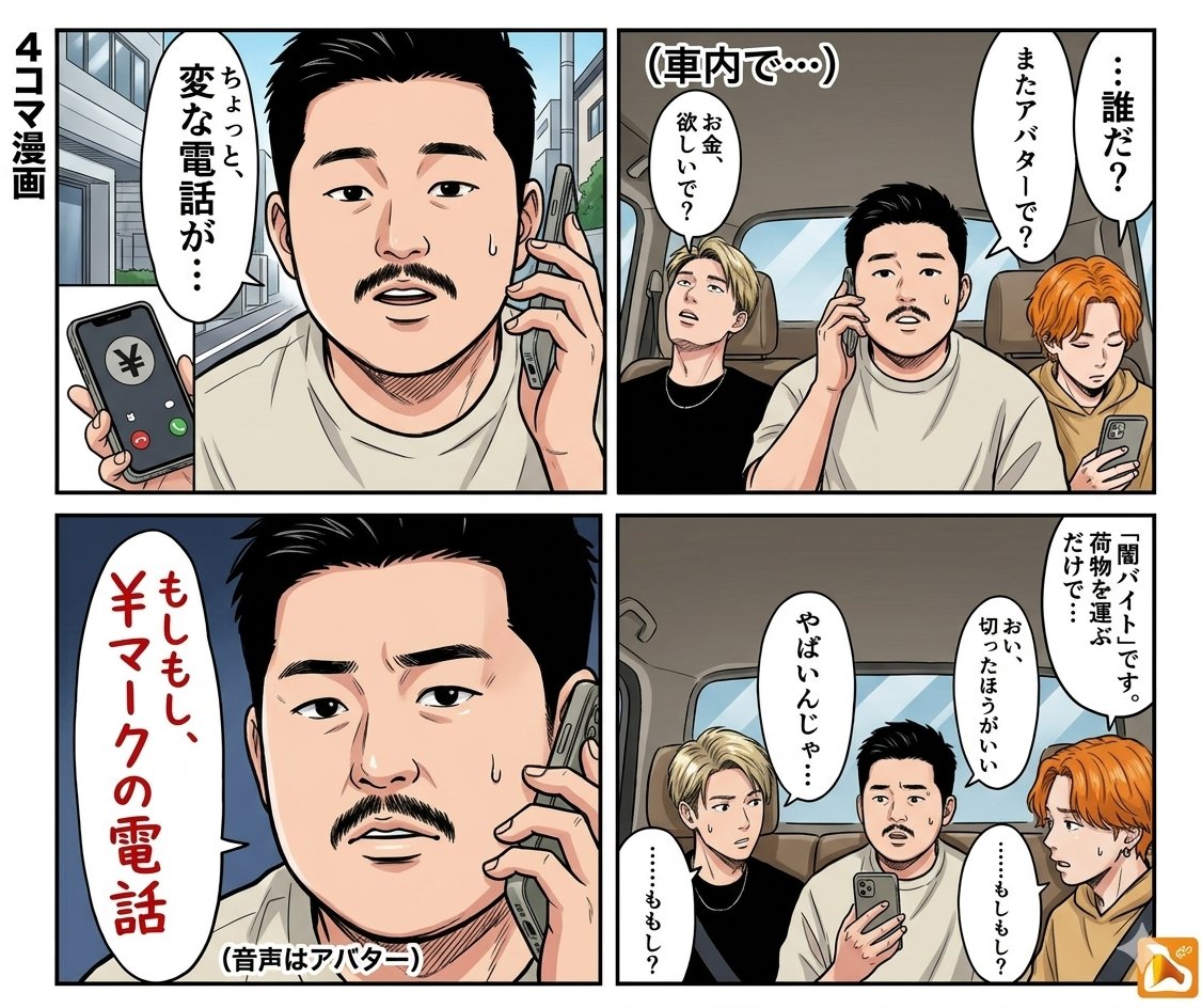 4-panel manga Title Anonymous and Mask Description: Inside a moving car. The smartphone of the man in the back seat (center of the image) rings. The display shows 'Unknown Number'...