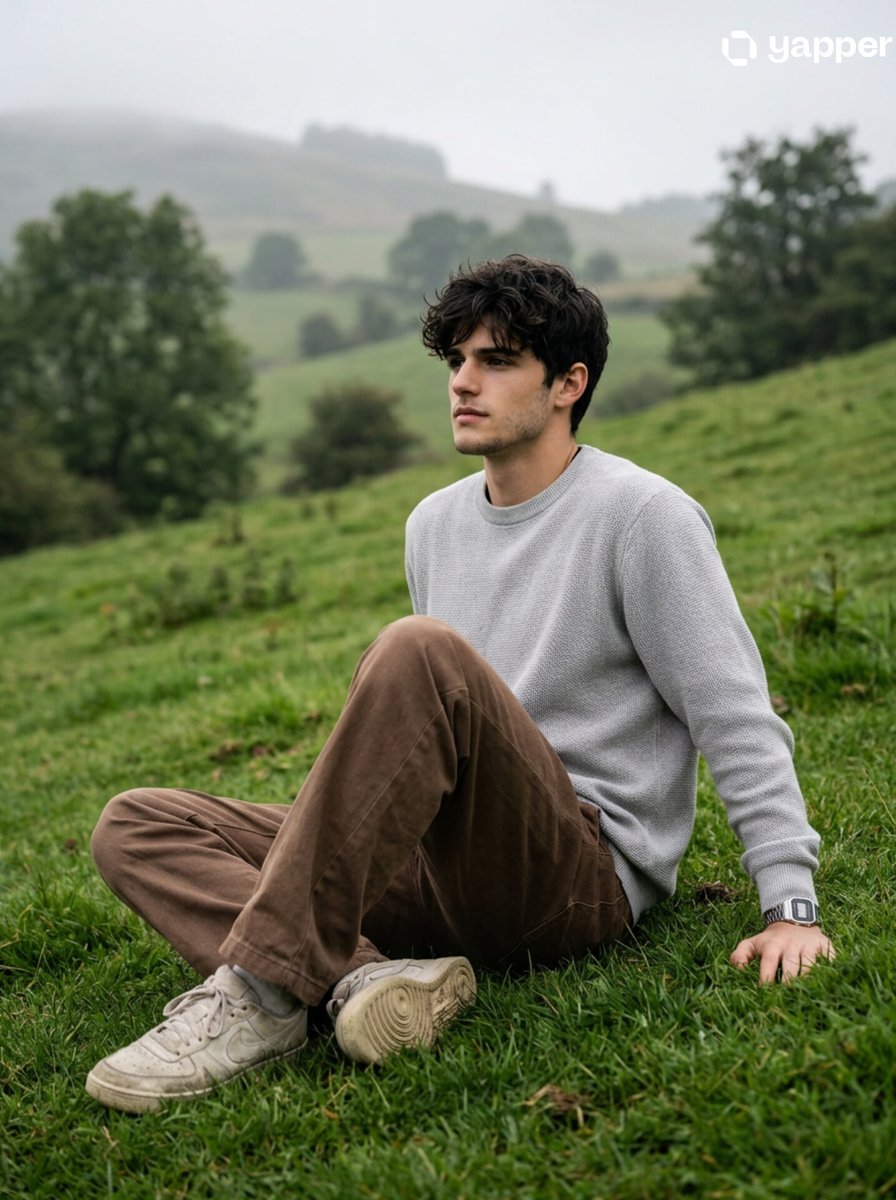 4K ultra-realistic Instagram portrait of a young man sitting casually on a grassy hillside. Face, skin tone, hair, and proportions must match the reference exactly reference image. He has wavy black hair, warm medium-tan skin, and a relaxed expression looking left. Outfit: light grey knitted sweatshirt, loose brown trousers, slightly worn light sneakers, and a silver rectangular digital watch. He sits with one knee raised, leaning back naturally. Background: misty green hills, scattered trees, soft overcast light, shallow depth of field with cinematic colors, natural textures, soft shadows, and HDR realism.