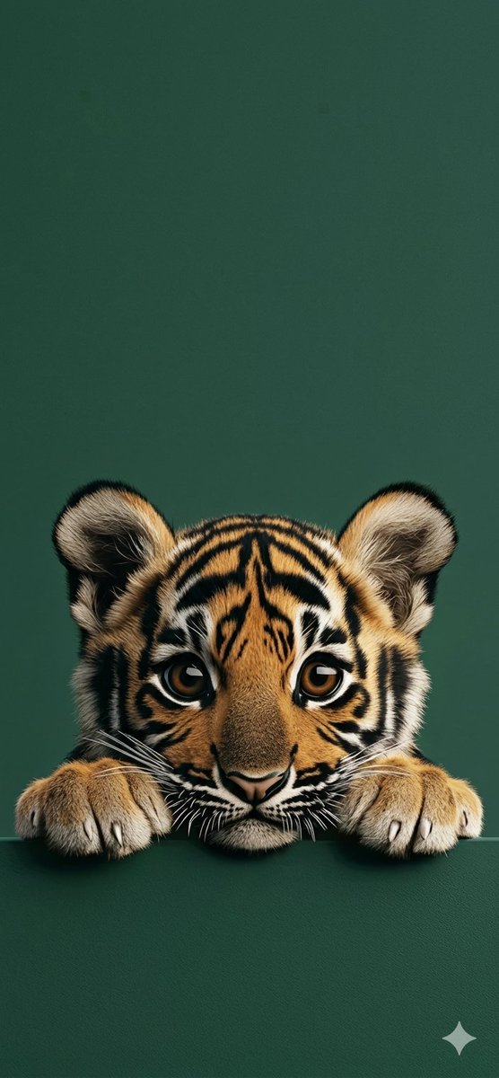 "A high-resolution photograph of a baby tiger cub, viewed head-on with an intense, curious gaze, peeking over a textured, dark green surface that matches the background. The cub's large brown eyes, full of wonder and innocence, are a prominent feature, drawing the viewer's focus. Its rounded ears are perked up, catching the light and emphasizing its attentive expression. The cub's front paws, with visible pads and small claws, rest on the ledge, positioned symmetrically on either side of its face. Its striking orange-gold fur is detailed with dark, well-defined black stripes, forming distinct patterns on its forehead, cheeks, and around its eyes. Soft, white fur accents are on its cheeks, inner ears, and chest. The cub's long white whiskers spread out prominently from its muzzle. The lighting is soft and even, highlighting the textures of the cub's dense fur, the shine in its eyes, and the pebbled texture of the green surface it is peeking over. The focus is critically sharp on the cub's eyes and face, capturing fine details in its fur, whiskers, and eye structure. The depth of field is shallow, rendering the rich green background as a smooth, uniform bokeh, free of any distracting details, to isolate the subject. The style is that of a professional wildlife portrait, with a natural yet intimate feel, as if a momentary glimpse into the cub's world. The composition is balanced and tight on the cub's head and paws, filling the lower portion of the frame."