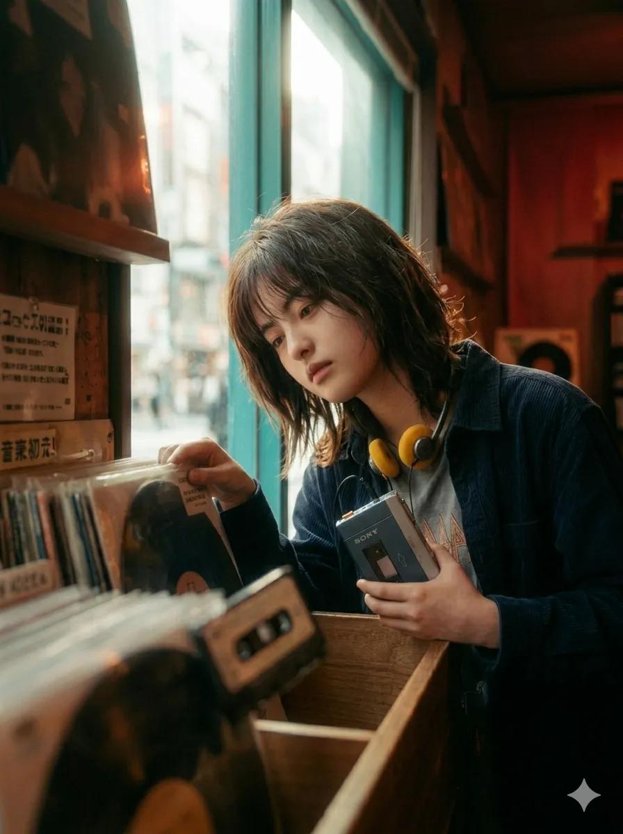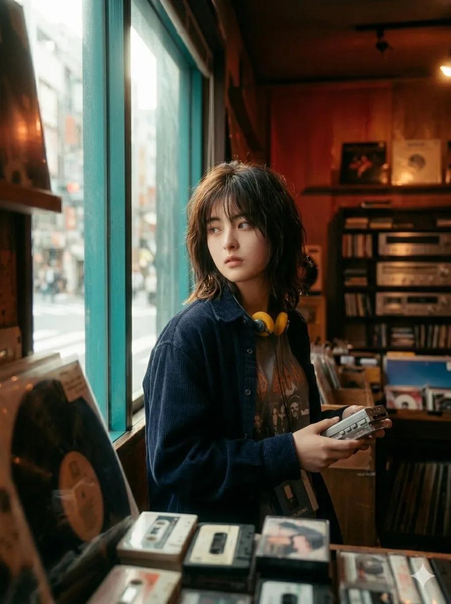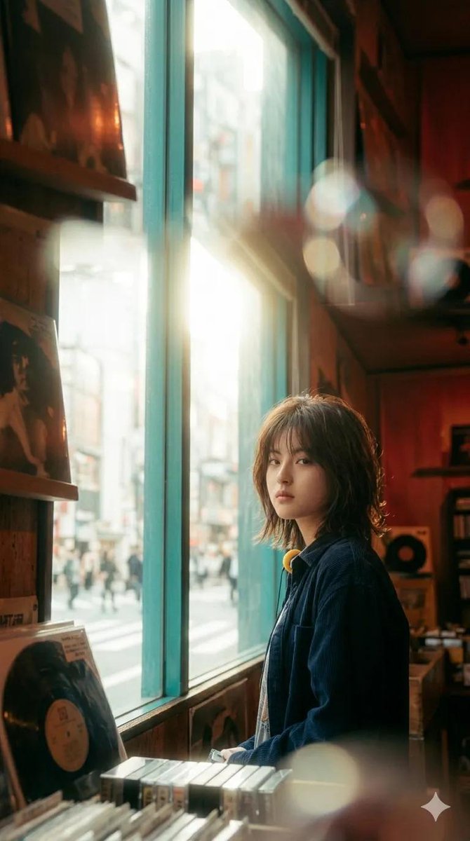 subject is captured in a candid, natural moment inside a {argument name="location" default="cluttered Japanese 1990s indie music store"} during daytime. Tight close-up shot (head and shoulders), dynamic canted composition with a slightly low and off-center angle that feels spontaneous and intimate.