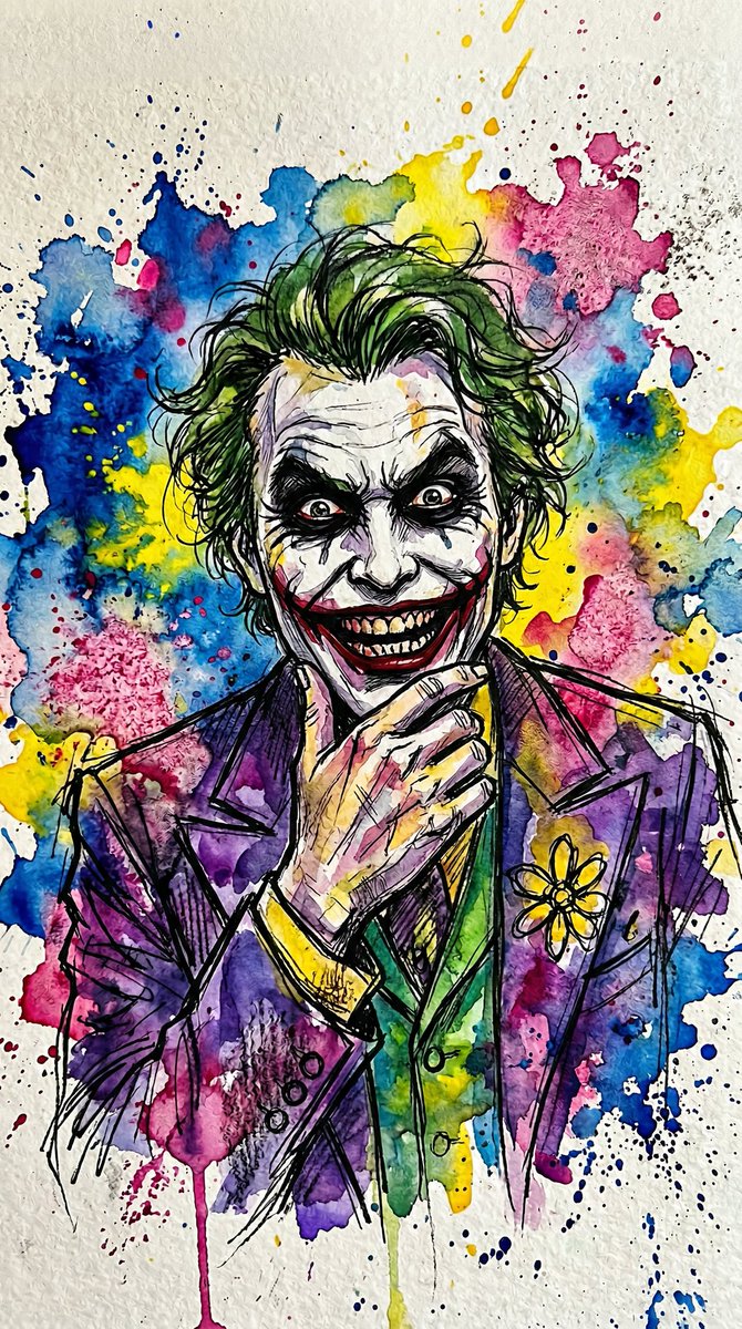 A prompt for generating an abstract artwork of the Joker with his signature smile. The style combines sketch-like lines with a watercolor splash effect in the background, focusing on vibrant colors, bold outlines, and high contrast.