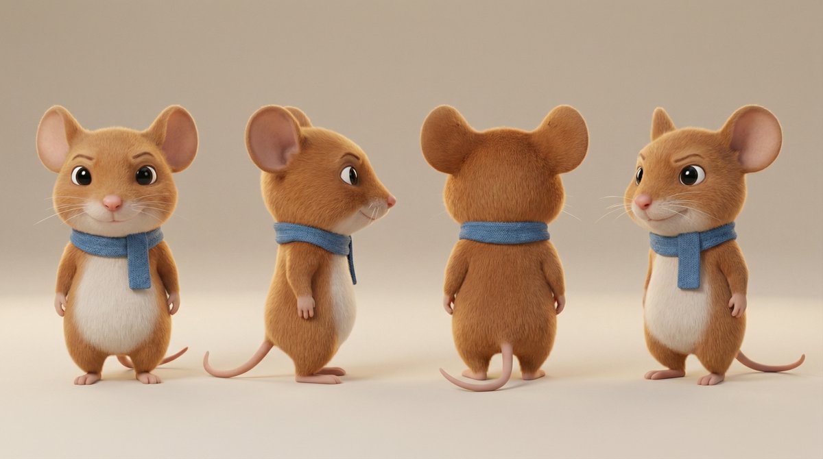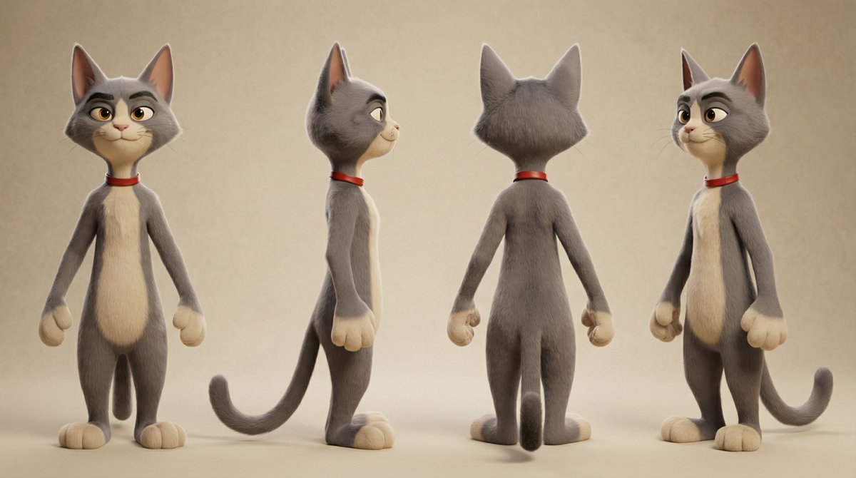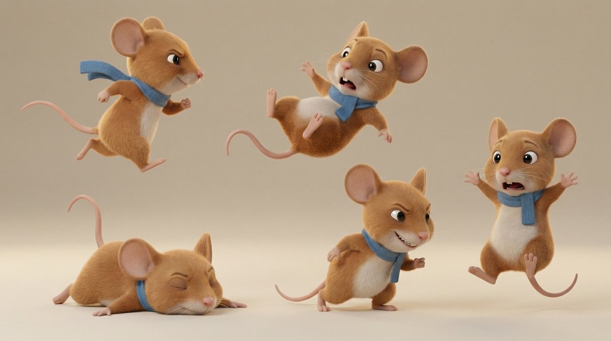 Character turnaround sheet of the same lanky grey housecat with oversized paws, cream muzzle, amber eyes, expressive black brows, tall triangular ears, slim elastic body, red collar. Show full body front view, side view, back view, and three-quarter view in one clean composition. Keep proportions identical in every angle. Tail fully visible. Neutral standing pose, arms relaxed, readable silhouette. premium stylized 3D family-film animation, rounded appealing shapes, soft groomed fur, clean neutral studio background, no props, no text, no watermark. Character turnaround sheet of the same tiny warm-brown mouse with round ears, quick black eyes, pale belly, tiny pink nose, slim tail, and tiny blue scarf. Show full body front view, side view, back view, and three-quarter view in one clean composition. Keep scarf shape, tail length, ear size, and body proportions identical in every angle. Neutral standing pose, readable silhouette. premium stylized 3D family-film animation, clean neutral studio background, no props, no text, no watermark. Action pose sheet of the same tiny warm-brown mouse with round ears, quick black eyes, pale belly, tiny pink nose, slim tail, and tiny blue scarf. Show full-body poses in one image. Exaggerated but clean slapstick silhouette, consistent anatomy and scarf shape. premium stylized 3D family-film animation, neutral studio background, no text, no watermark. Action pose sheet of the same lanky grey housecat with oversized paws, cream muzzle, amber eyes, expressive black brows, tall triangular ears, slim elastic body, red collar. Show full-body poses in one image: sneaking low, mid-pounce, skidding stop, hanging from one paw, pancake-splat pose, triumphant pose. Exaggerated but clean slapstick silhouette, consistent anatomy, same proportions in every pose. premium stylized 3D family-film animation, neutral studio background, no text, no watermark