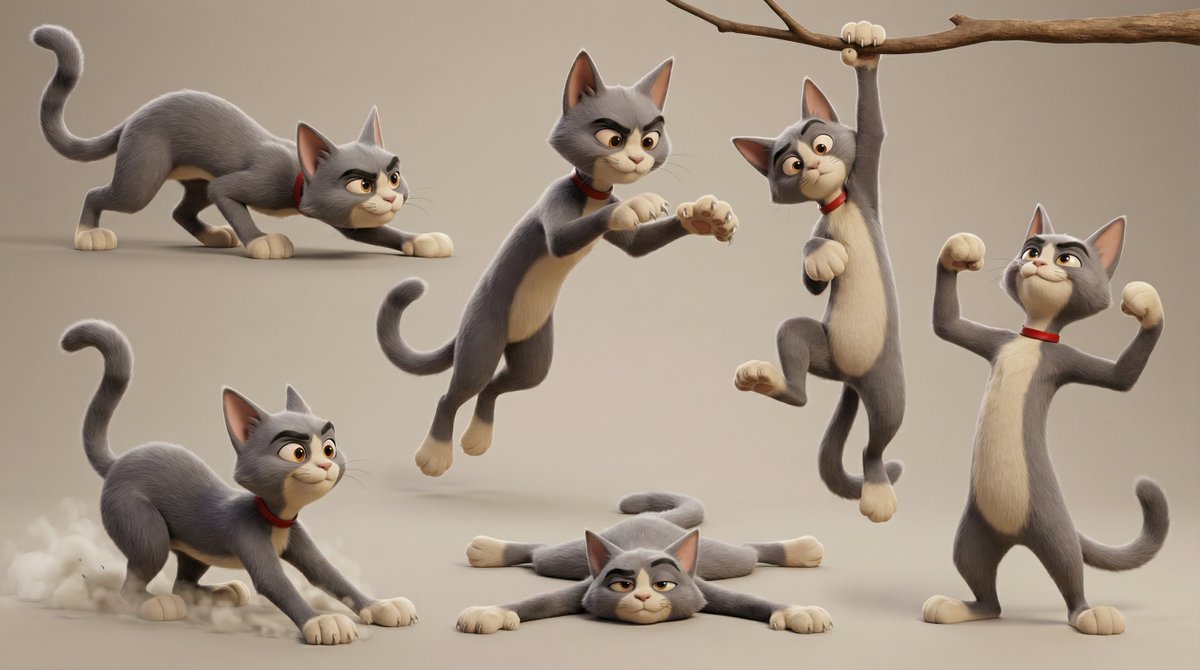 Nano Banana Pro AI image example generated with this reusable CDance AI prompt: A prompt for generating an action pose sheet for the stylized 3D animated lanky grey housecat, including specific poses like mid-pounce…