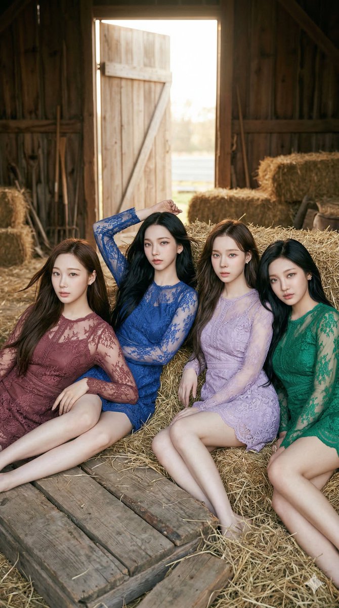 A structured JSON prompt for Nano Banana 2/Pro to generate a photorealistic image of the K-Pop group aespa (Karina, Winter, Giselle, Ningning) reclining in a rustic barn setting. The prompt specifies individual member features, unique colored lace minidresses, soft golden hour lighting, and a focus on high photorealism and natural skin texture.
