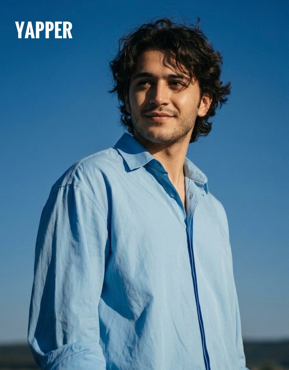 Ultra aesthetic cinematic outdoor half portrait taken from a slightly longer distance. A young man with natural messy wavy hair stands under a clear deep blue sky. He wears a loose sky-blue oversized shirt with soft fabric folds and relaxed styling. His pose is natural and calm, shoulders slightly turned while he looks away from the camera with a gentle smile. Sunlight from the side creates cinematic lighting and soft shadow contours. The background is mostly rich blue sky with slight blur. Professional DSLR photography, ultra realistic 4K detail, soft film grain, subtle noise texture smooth cinematic tones, fashion editorial aesthetic.