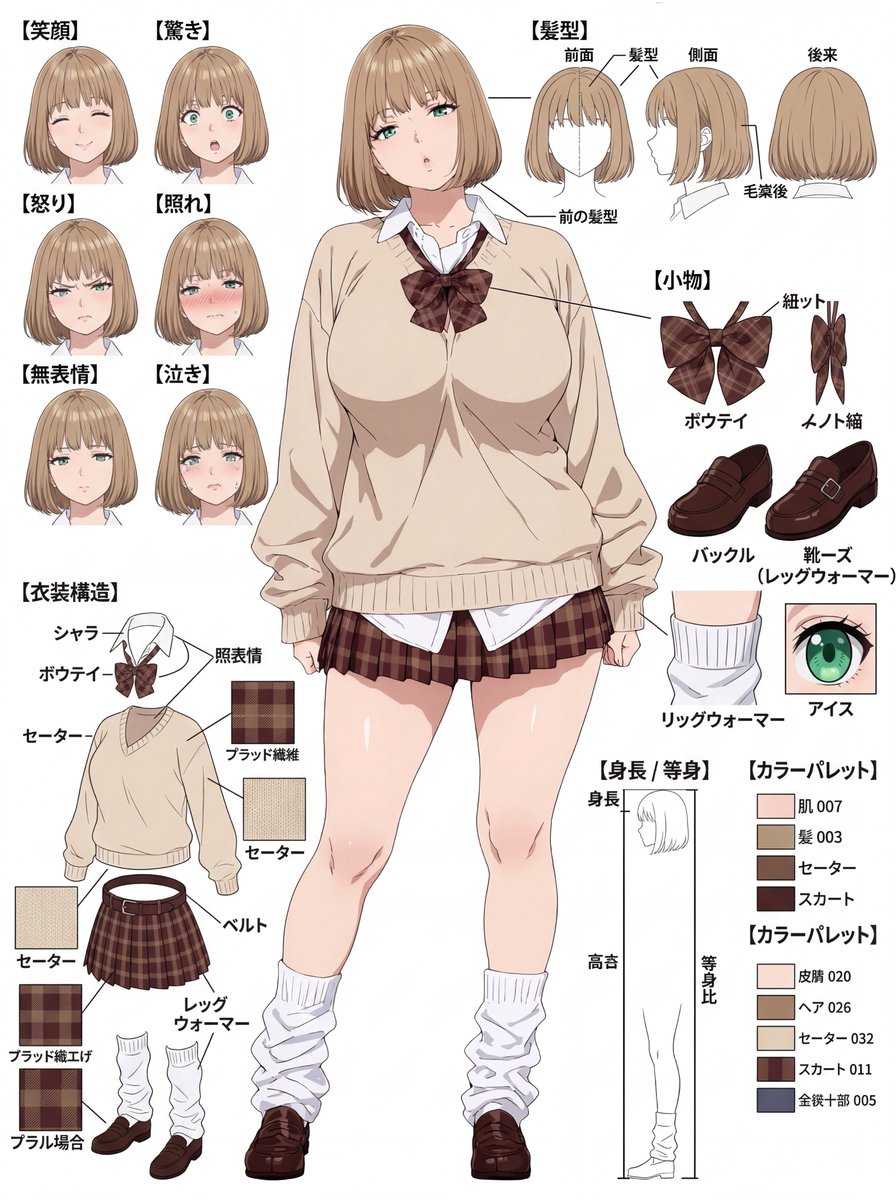 (masterpiece, best quality, official art, character design sheet, reference sheet, settai-ga, production materials), (cel shading, flat colors, clean lines), (central anchor:1.5): (full-body standing pose:1.4) of the character from image_8.png, positioned prominently in the center of the sheet, large scale. (Maintain original art style and character details from image_8.png exactly:1.6), including hair color, eye color, skin tone, and outfit. (No back view:1.5). (Surrounding elements), arranged neatly with annotated leader lines: [Facial Expressions]: A row of 5 distinct headshots showing different emotions (e.g., joyful, angry, sorrowful, surprised, blushing). [Outfit Layering]: Exploded view of the main outfit showing outer layers removed to reveal inner clothing structure. (Do not include "innerwear specification" or any other innerwear section:1.5). [Accessories & Props]: Close-up details of shoes, jewelry, or weapons held by the character. (Text & Annotations): All text annotations are in JAPANESE kanji and kana (e.g., "Expression Collection", "Outfit Composition", "Material Specification", "Color Palette"). Hand-drawn notes style. (Technical Tags): (anime coloring:1.4), (line art:1.3), (flat colors:1.2), clean lines, precise details, white background. (Negative prompt): (3d, realistic, photorealistic, cgi:1.5), (altering character features:1.5), (changing hairstyle:1.5), (western comic style), shading, complex background, (real world brand logos:1.5), messy layout, (multiple full body views:1.5), (back view:1.5), (conflicting innerwear sections:1.5).