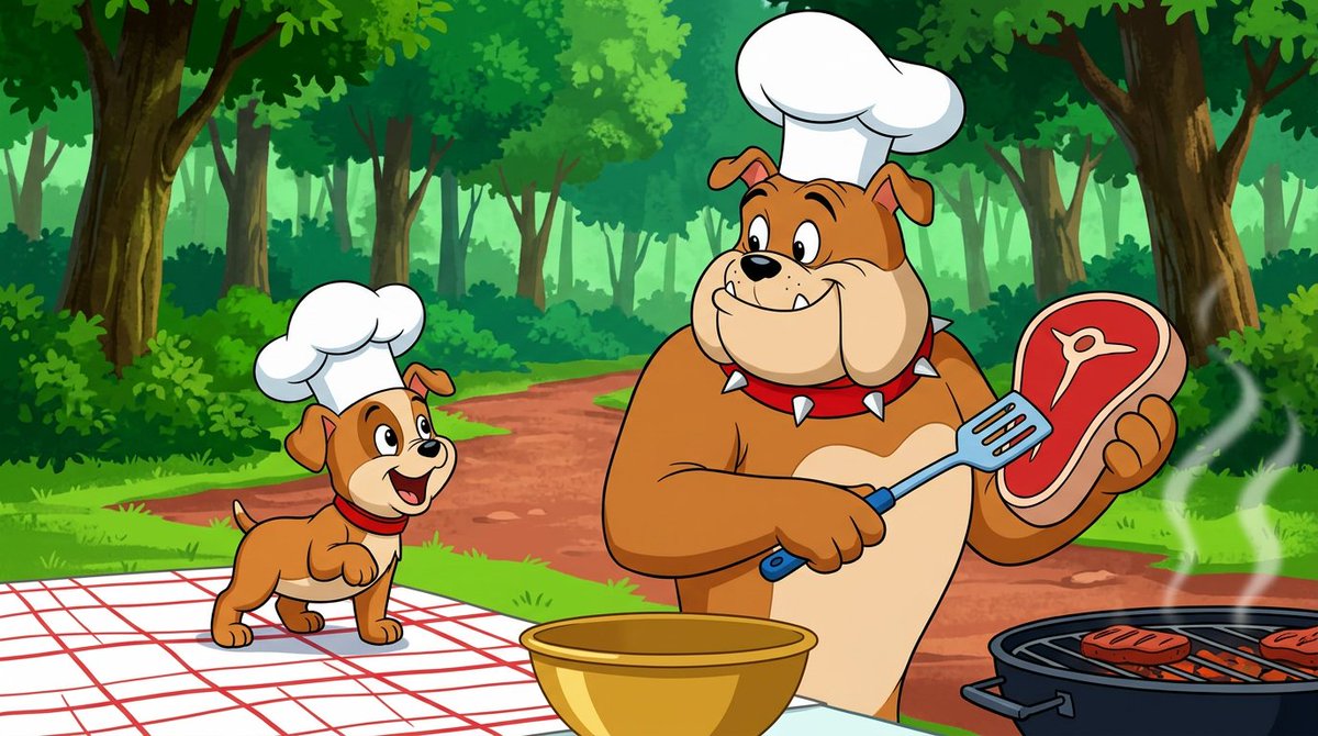 "aiPromptOptimized": "A vibrant, cheerful, and highly saturated classic cel animation still, reminiscent of Hanna-Barbera or Golden Age animation. The scene depicts an anthropomorphic adult bulldog and a puppy, both joyfully wearing white chef hats, engaged in an outdoor barbecue. The larger bulldog, positioned right-of-center in the mid-ground, holds a cartoonishly large, prime red steak with a blue spatula, displaying a happy, expectant expression. He wears a prominent red spiked collar. The smaller puppy, mirroring the adult's enthusiasm, stands excitedly on a white and red checkered picnic tablecloth to the left, also sporting a red collar. The composition features an eye-level, medium wide shot with deep focus, showcasing multiple layers: a lush green forest forms the background, a reddish-brown path winds through it, and foreground elements include a golden mixing bowl and a black barbecue grill with sizzling food. Natural midday sunlight provides soft, even front-lighting, creating a perfectly exposed and clean image. The dominant colors are vibrant greens, warm browns, bright reds, and clean whites, contributing to a joyful and wholesome atmosphere. The overall energy is lively yet calm, capturing a moment of happy anticipation at a sunny outdoor gathering."Related Nano Banana Pro Prompts
