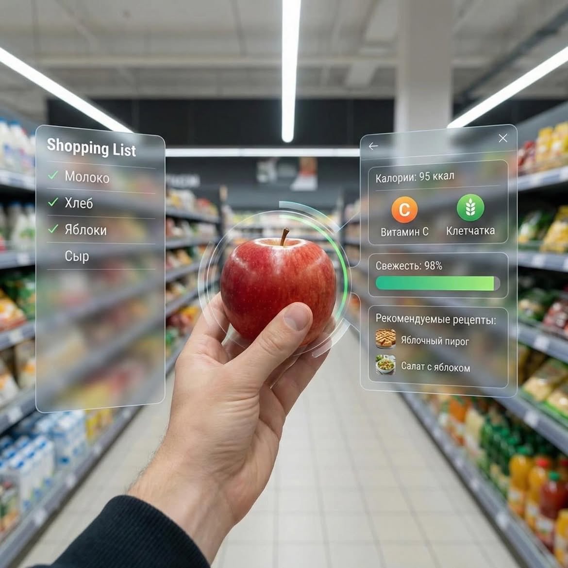 Dessert (AR shopping UI) POV shot inside a modern supermarket aisle, hands holding a small gourmet dessert with cream and berries, futuristic augmented reality (AR) interface overlay showing calories, sugar, fats, freshness score, expiry date, and recipe suggestions, soft depth of field, cinematic lighting, ultra-realistic, 4K, tech-inspired UI, clean glassmorphism design ⸻ 2. Apple (AR nutrition UI) First-person view in a grocery store holding a fresh red apple, augmented reality interface displaying calories, vitamin C, fiber, freshness bar, and recipe ideas, minimal futuristic UI panels floating around the object, bright supermarket lighting, shallow depth of field, hyper-realistic, modern tech aesthetic, 4K ⸻ 3. Orange Soda Bottle (AR data UI) POV shot of hands holding an orange soda bottle in a supermarket aisle, futuristic AR overlay showing calories, sugar content, caffeine level, freshness score, expiry date, and drink recipes, sleek holographic interface, glassmorphism UI, vibrant colors, cinematic lighting, ultra-detailed, photorealistic, 4K