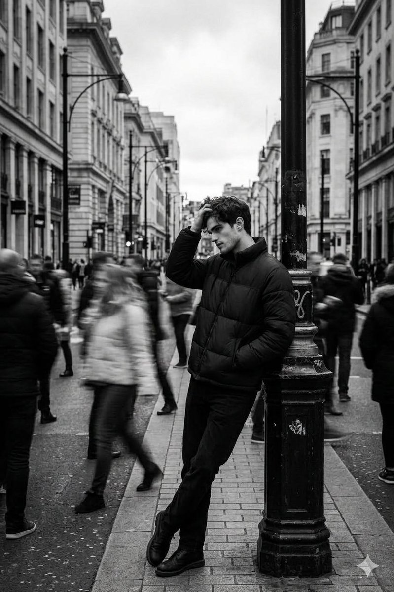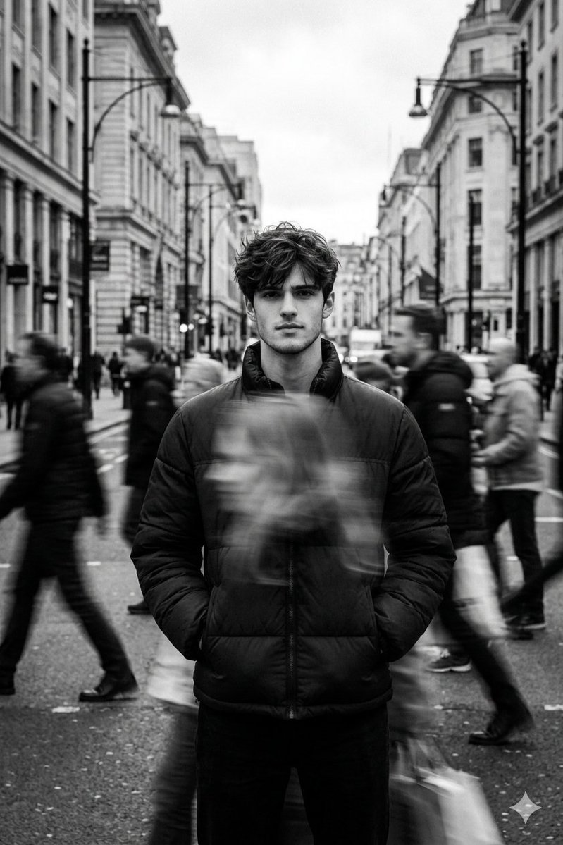 Black and white cinematic street portrait of a young man standing still in the center of a busy city street. The subject as a refrence image is calm and confident, looking directly at the camera with a relaxed expression. He has medium length slightly messy hair, light beard and mustache. He is dressed in a dark puffer jacket with hands casually inside the pockets. The background shows a crowded urban street with people walking quickly in different directions, creating strong motion blur around the subject. The moving crowd appears streaked and ghostlike due to slow shutter speed, while the subject remains perfectly sharp and in focus. Old style city buildings and street details are softly blurred in the background, giving a cinematic depth of field. The lighting is natural and diffused, creating soft highlights and shadows on the face. The image has a dramatic urban atmosphere with high contrast black and white tones. Shot on a professional camera, 50mm lens, shallow depth of field, subject centered in frame, vertical composition, sharp focus on the subject, motion blur surrounding the subject, documentary street photography style, cinematic realism, high detail, professional photography, moody urban aesthetic.