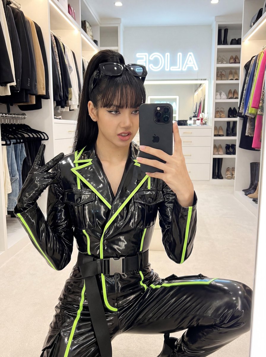 "prompt": "Photorealistic full-body mirror selfie of {argument name="subject name" default="Jennie Kim"} from Blackpink. She has her signature cat-like eyes with precise winged eyeliner, soft glowing skin, and long, sleek dark brown hair pulled into a high tight ponytail. She has a confident, chic expression looking into the camera. She wears oversized black rectangular sunglasses perched on her head. Outfit: a sophisticated high-gloss black latex jumpsuit with bold pink trim along the tailored turtleneck and full-length sleeves. The jumpsuit is cinched with a thick black leather belt featuring a large silver buckle. It features precise tailoring and subtle ankle zippers. She wears matching black latex gloves. She holds a black iPhone with triple cameras in her right hand, left hand resting casually on her hip. Pose: Standing comfortably, legs slightly crossed at the ankle, leaning against the shelving unit. Background: luxurious walk-in closet with white shelving units filled with designer shoes, neatly hung clothing, and a small neon 'Alice' sign on a shelf. Bright even indoor lighting, 8k quality.",