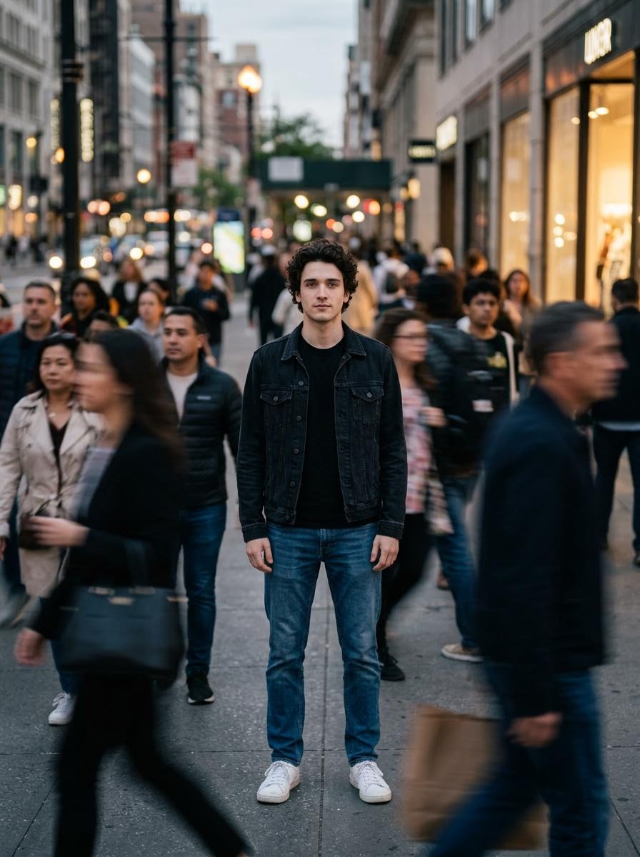 Create a realistic photo of a person using the face from the uploaded image. The person is standing still in the middle of a busy street or public place, looking calm and confident. Many people are moving around them, but they appear blurred because of motion, while the main person is sharp and in focus. The camera is at eye level, centered on the person. The background looks like a city with soft lights and buildings. The person is wearing simple stylish clothes like a t-shirt, jacket, jeans, and sneakers. The lighting is natural and slightly cinematic with soft shadows. The overall scene should feel calm in the middle of chaos, with clear focus on the person and blurred crowd movement around.