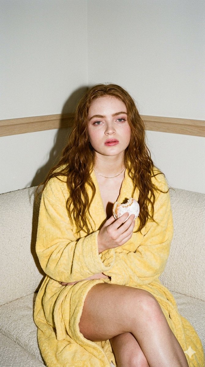 "full_text_prompt": "A candid, editorial-style photograph shot on 35mm film with direct on-camera flash. A woman with long wavy red hair and pale skin is wearing a bright yellow terrycloth bathrobe and a delicate gold chain necklace. She is sitting with her bare legs crossed on a textured cream bouclé sofa in the corner of a minimalist room with white walls and light wood trim. She is holding a partially eaten powdered donut in one hand and looking directly at the camera with a calm, neutral expression. The direct flash creates a distinct, hard shadow on the wall behind her, giving the image a raw, nostalgic, and intimate aesthetic."