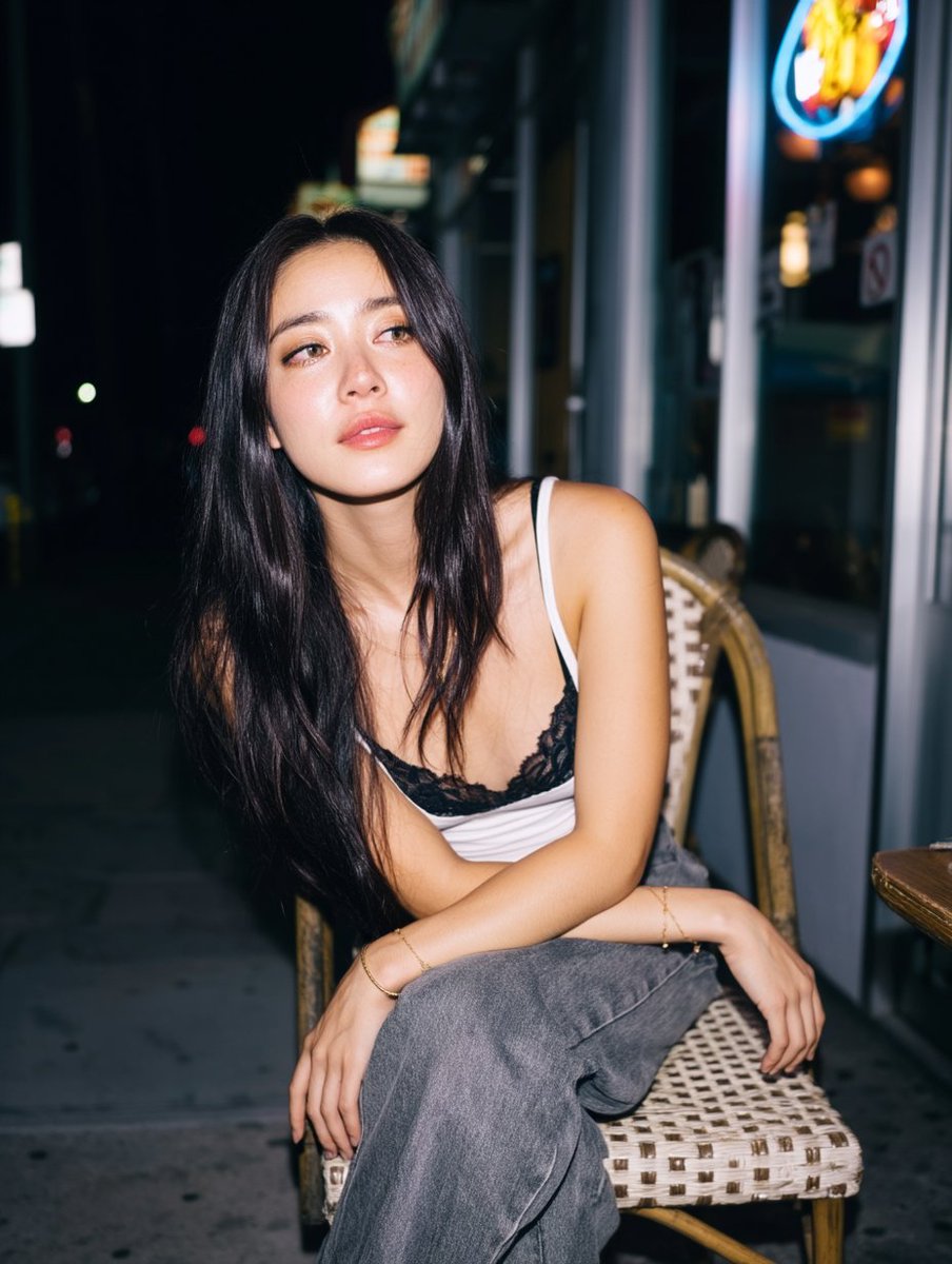 A candid nighttime street portrait of a young woman sitting casually on a woven café chair outside a small urban restaurant. She has long black hair, natural makeup with a soft glow, and wears a white tank top layered over a black lace bralette, paired with relaxed denim jeans. She leans slightly to the side with one arm resting on the chair, looking off-camera with a calm, introspective expression. Subtle accessories include thin gold bracelets and a delicate necklace. The scene is lit with a direct flash, creating sharp highlights on her skin and a contrast against the dark street background. Neon signs and reflections from glass windows add pops of color, while the sidewalk and storefront create an authentic city nightlife vibe. Medium shot, shallow depth of field, film-like grain, flash photography aesthetic, raw and unfiltered mood, stylish yet natural composition