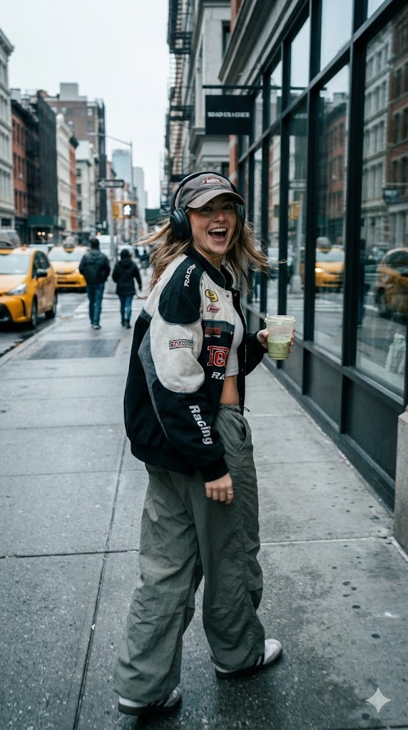"outfit": "Oversized vintage racing jacket, baggy low-rise parachute pants, tiny crop top, chunky headphones worn over a baseball cap"