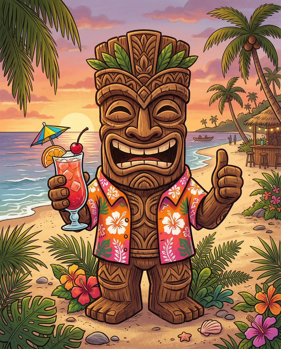 A prompt for Nano Banana 2 to generate an illustrative and cartoonish image of a wooden tiki statue wearing a vibrant Hawaiian shirt, holding a cocktail, and giving a thumbs-up gesture against a tropical background.