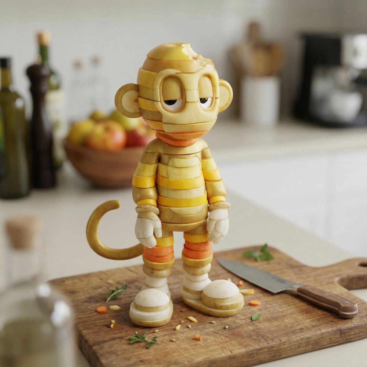 create a version of this character made entirely of sliced vegetables and fruits vegetables and fruits: should match the uploaded character’s colors as closely as possible, without changing their natural look slices: slightly misaligned, with visible separation between layers structure: a small bite taken out of the top of the head, forming a clean cut surface ambience: kitchen setting, on a cutting board with scattered vegetables and a knife nearby camera: slightly top-down angle effect: tilt-shift Likeness Preservation (CRITICAL): Maintain exact proportions, eye shape, spacing, stylization, silhouette, and material identity from the reference Do not humanize Do not reinterpret anatomy Do not modify facial structure Identity must remain perfectly intact and instantly recognizable Character Compatibility Rules: If the uploaded character is 2D, convert it into a believable realistic 3D render while preserving the original design, proportions, colors, and visual identity Do not modify facial structure Do not add a mouth or nose if the uploaded character does not have them 👟 FOOTWEAR & ACCESSORY MATERIAL OVERRIDE (CRITICAL FIX) All parts of the character, including footwear and clothing, must follow the same fruit and vegetable slice construction. • shoes must be made entirely of stacked fruit and vegetable slices • preserve the exact shoe shape, proportions, and design • recreate panels, sole, and details using layered slices Material examples for shoes: • sole → dense stacked potato or root vegetable slices • upper panels → fruit/vegetable slices arranged to match original color blocking • edges and seams → visible slice layering and separation 📷⚠️ 0px; letter-spacing: normal; orphans: 2; text-indent: 0px; text-transform: none; widows: 2; word-spacing: 0px; -webkit-text-stroke-width: 0px;"> IMPORTANT: No original materials should remain (no fabric, rubber, or leather). Everything must be converted into fruit/vegetable slice construction while keeping the original design recognizable. ar 1:1