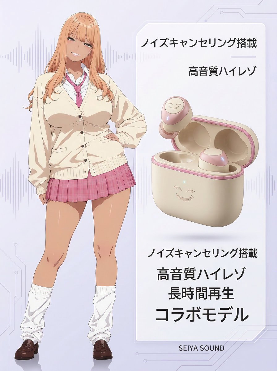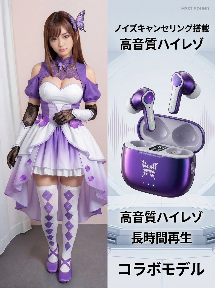A detailed prompt for Nano Banana 2 to create a product photography visualization of wireless earbuds and their charging case, based on an input character image. The composition is a split screen, with the character on the left and the tech product on the right, featuring colors and motifs derived from the character's outfit. Includes specific technical and branding requirements in Japanese.