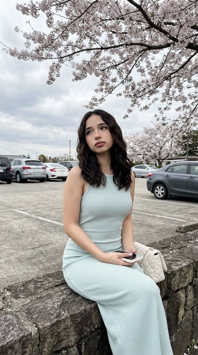 Subject seated on stone wall (~50% frame), camera ~3m. Upper frame: overcast sky + cherry blossom canopy (~40%). Lower frame: concrete parking lot (~20%).