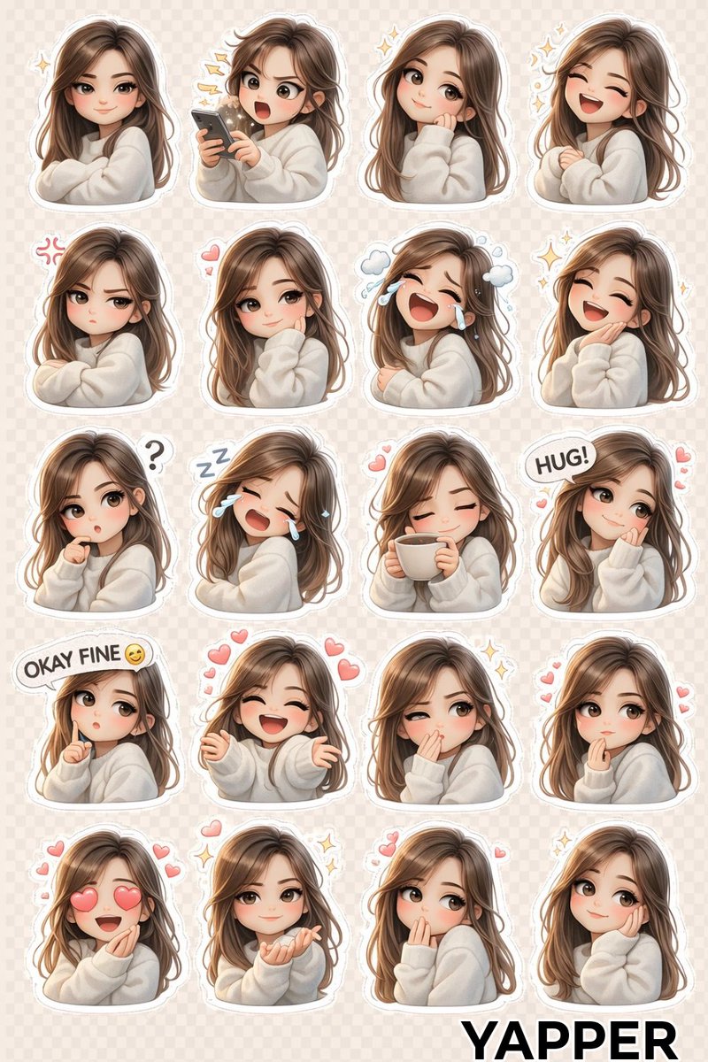 A sticker sheet of a cute anime chibi girl with long brown hair and a white sweater, multiple poses and facial expressions (happy, angry, crying, sleeping), white border around each character, flat 2D vector style, high resolution, white background