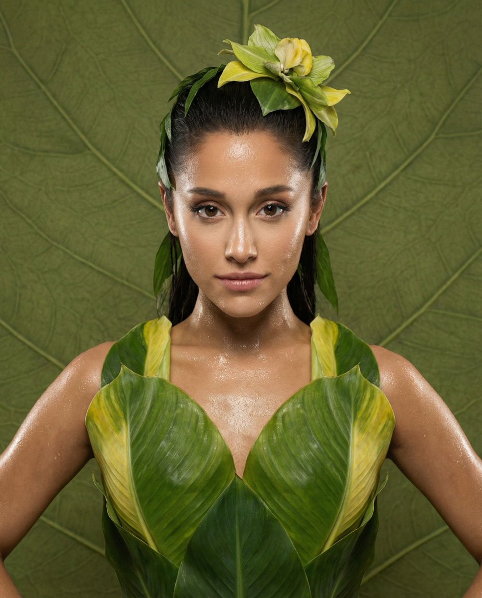 "master_prompt": "A hyper-realistic, symmetrical medium-format portrait of The Protagonist, framed in a Centered Power-Mid composition. The subject is adorned in an architectural haute couture garment constructed from oversized, living emerald and sulfur-yellow plant membranes, layered like organic armor. The skin texture is defined by the 'High-Gloss Rebel' aesthetic: intensely dewy, sweaty, and reflective, with visible pores and razor-sharp specular highlights on the cheekbones and forehead. The expression is challenging and direct, featuring a slight, arrogant smirk. Lighting is a harsh, direct ring-flash style, eliminating central shadows while maximizing the wet sheen of the skin. The background is a tactile, textured olive-green canvas that mimics the veining of a leaf. Shot on a Hasselblad H6D-100c with an 80mm prime lens, emulating the vivid saturation of Fujifilm Velvia 50 stock. No neon. Pure, tactile editorial surrealism.",