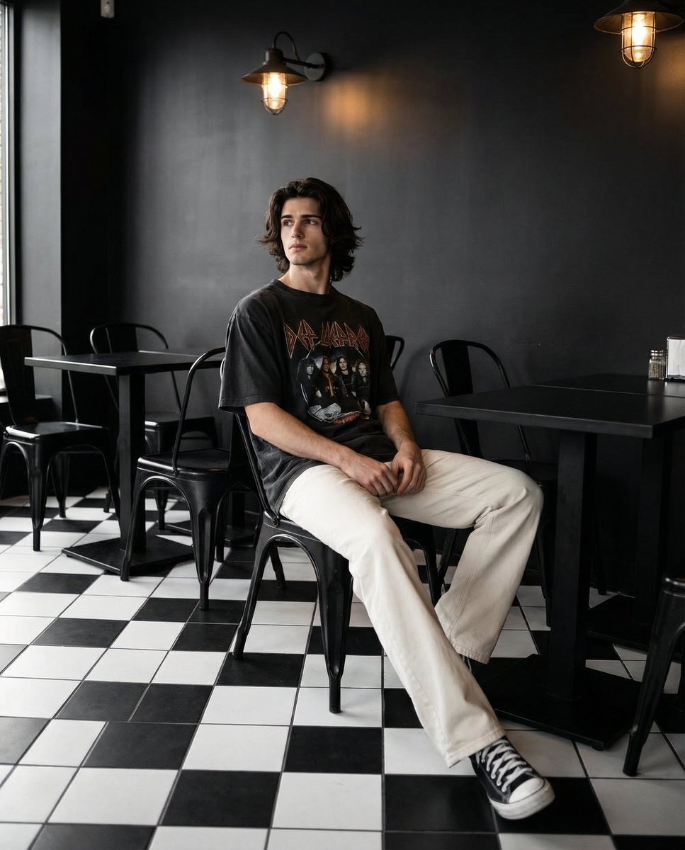 A full-body cinematic portrait of a stylish young man with flowing mid-length dark hair, sitting relaxed in a modern cafe with a monochrome aesthetic. He is wearing an oversized dark vintage graphic T-shirt and light cream-colored wide-leg trousers. The floor is a striking black-and-white checkered tile pattern. The cafe interior features dark matte walls, industrial black furniture, and warm overhead lighting creating deep shadows. High-contrast photography, wide-angle lens.