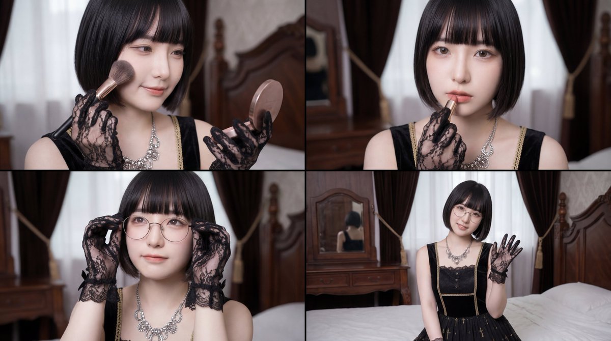 A cinematic close-up of a woman enveloped in soft light. After touching up her skin with a makeup brush and carefully applying lipstick, she gently puts on her glasses with both hands and smiles shyly. Her adorable gesture of waving slightly at the camera and tilting her head after finishing her preparations smoothly fades out with beautiful bokeh, creating an emotional video.