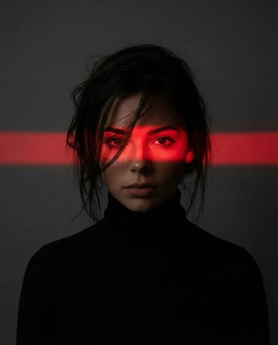Cinematic studio portrait of a young man with messy textured hair, wearing a black turtleneck, centered composition, dark minimal background, dramatic low-key lighting, a horizontal red neon light strip cutting across his eyes, strong contrast shadows covering lower face, intense gaze, moody atmosphere, cyberpunk aesthetic, ultra-realistic, sharp focus, 85mm lens, shallow depth of field, high detail, editorial photography style. Prompt 2 (Female portrait): Cinematic studio portrait of a young woman with slightly messy tied-back hair, wearing a black turtleneck, centered composition, dark minimal background, dramatic low-key lighting, a horizontal red neon light strip across her eyes, soft yet intense expression, deep shadows on lower face, high contrast, moody cyberpunk vibe, ultra-realistic, sharp focus, 85mm lens, shallow depth of field, high detail, editorial fashion photography.