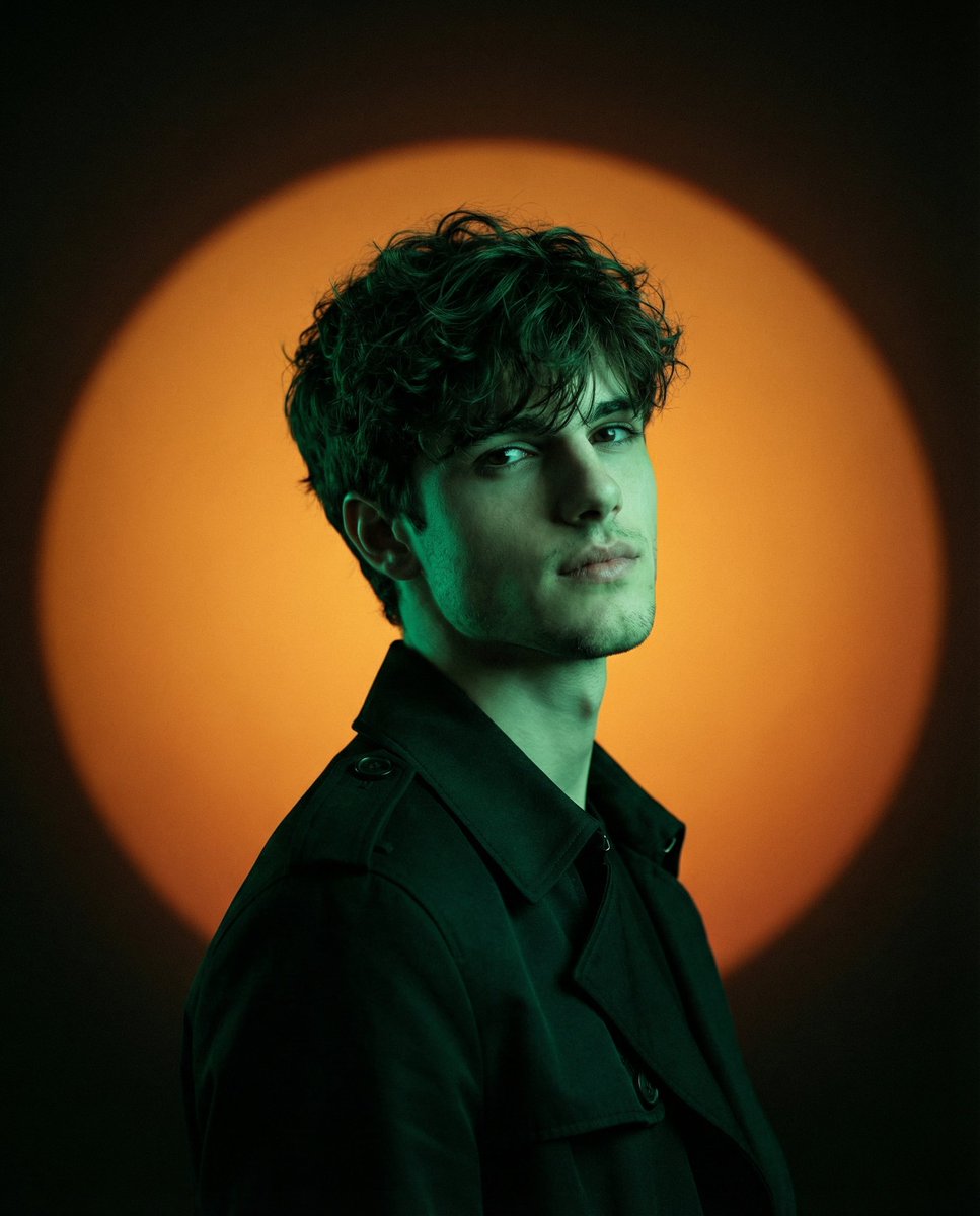 Using a person's photo as the identfy refrence, create a minimalist cinematic fashion-editorial studio portrait with dramatic colored-gel lighting: vertical 4:5, mid-torso to head framing with generous negative space above, subject placed slightly left of center: pose: shoulders angled 3/4, head turned back toward camera, chin slightly lifted: expression calm, cool, slightly aloof, lips softly parted, eyes relaxed and focused: wardrobe: clean structured trench coat or minimalist overcoat with wide lapels and a single shoulder epaulette detail, no logos, no jewelry: lighting: strong saturated emerald-green gel key from camera-right/front-right (-5200K base under green gel) wrapping the face and coat, deep falloff into shadow on the far side, subtle soft fill from camera-left at very low intensity: background: a large circular "sun" spotlight/soft projection centered behind the head with a smooth radial gradient-bright amber core (#FF8A00) fading to deep burnt orange (#C43412) and then into near-black warm brown edges (#120408), perfectly clean and textureless: optics: 85mm portrait look, 1/2-1/2.8 shallow DOF (eyes tack sharp, background creamy), gentle bloom on highlights, smooth cinematic contrast, subtle film grain, rich color separation (green subject against orange halo), crisp micro-texture in fabric weave, controlled skin texture, no text, no watermark. Editorial, modern, high-detail, cinematic composition, ultra-realistic textures, professional fashion photography style.
