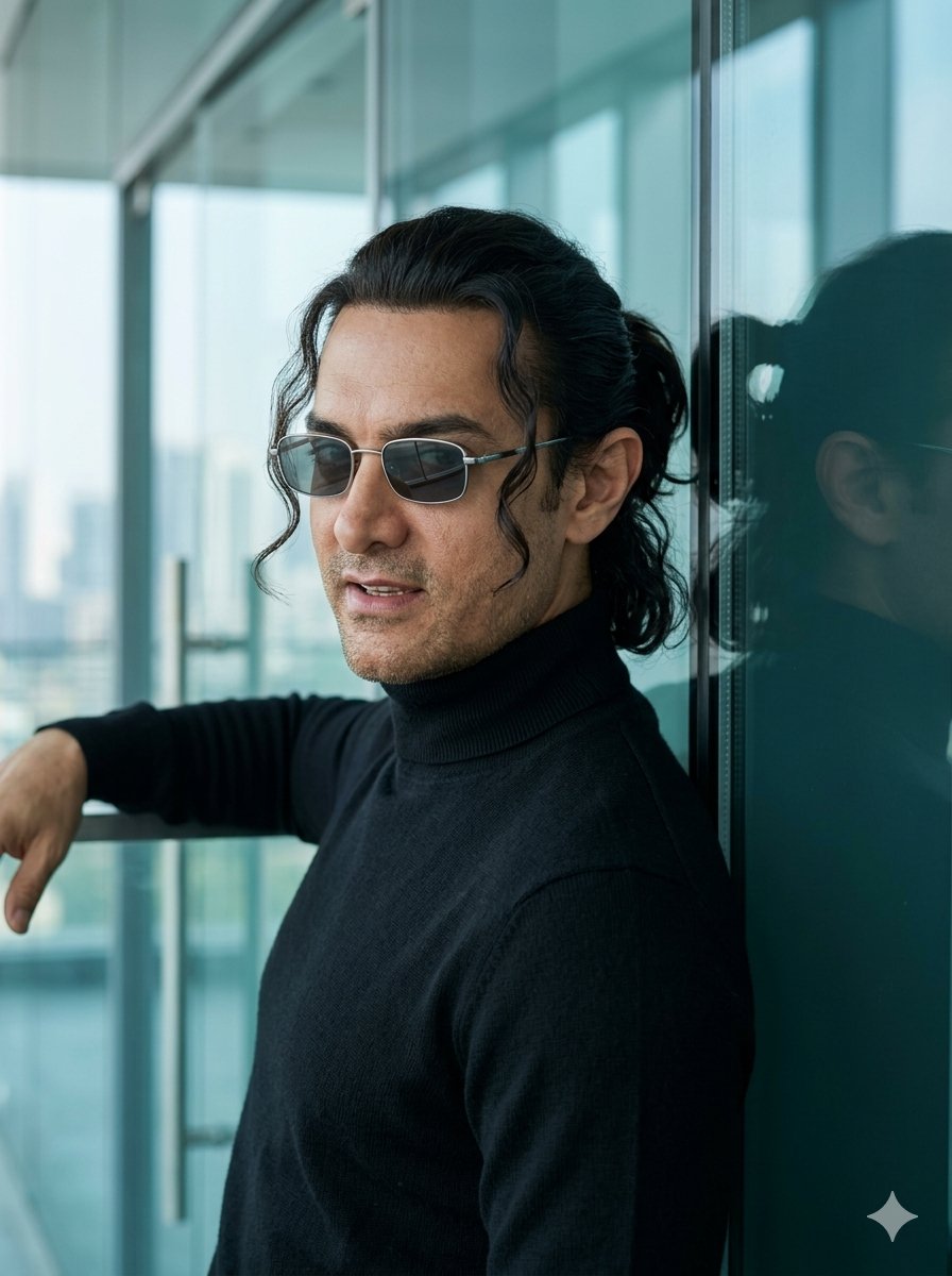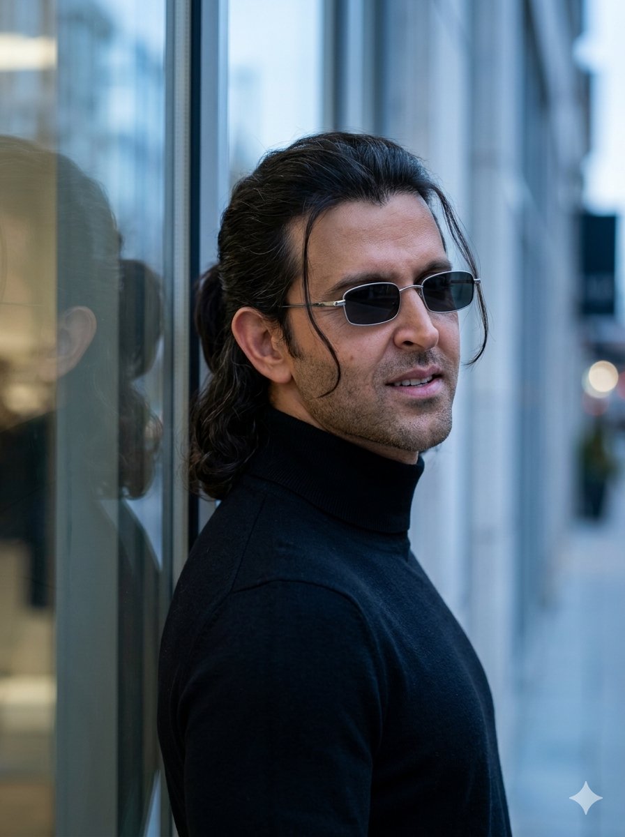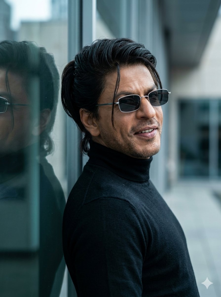 A highly detailed cinematic portrait of {argument name="subject name" default="Shah Rukh Khan"}, a handsome Indian man in his late 40s to early 50s, with sharp facial features, light stubble, and a confident subtle smile showing teeth. He has dark black medium-length hair styled in a sleek, slightly messy ponytail with a few strands falling over his forehead. He is wearing {argument name="accessories" default="small rectangular silver-framed sunglasses"} and a fitted black turtleneck sweater. He is standing in a three-quarter profile view, leaning casually against a large modern glass building, looking over his shoulder directly toward the viewer. His reflection is clearly visible on the glossy glass surface behind him. Soft natural daylight with cool urban reflections, moody and stylish atmosphere, sharp focus, realistic photography, 8k resolution, {argument name="style" default="fashion portrait style"}, cinematic lighting.Related Nano Banana Pro Prompts