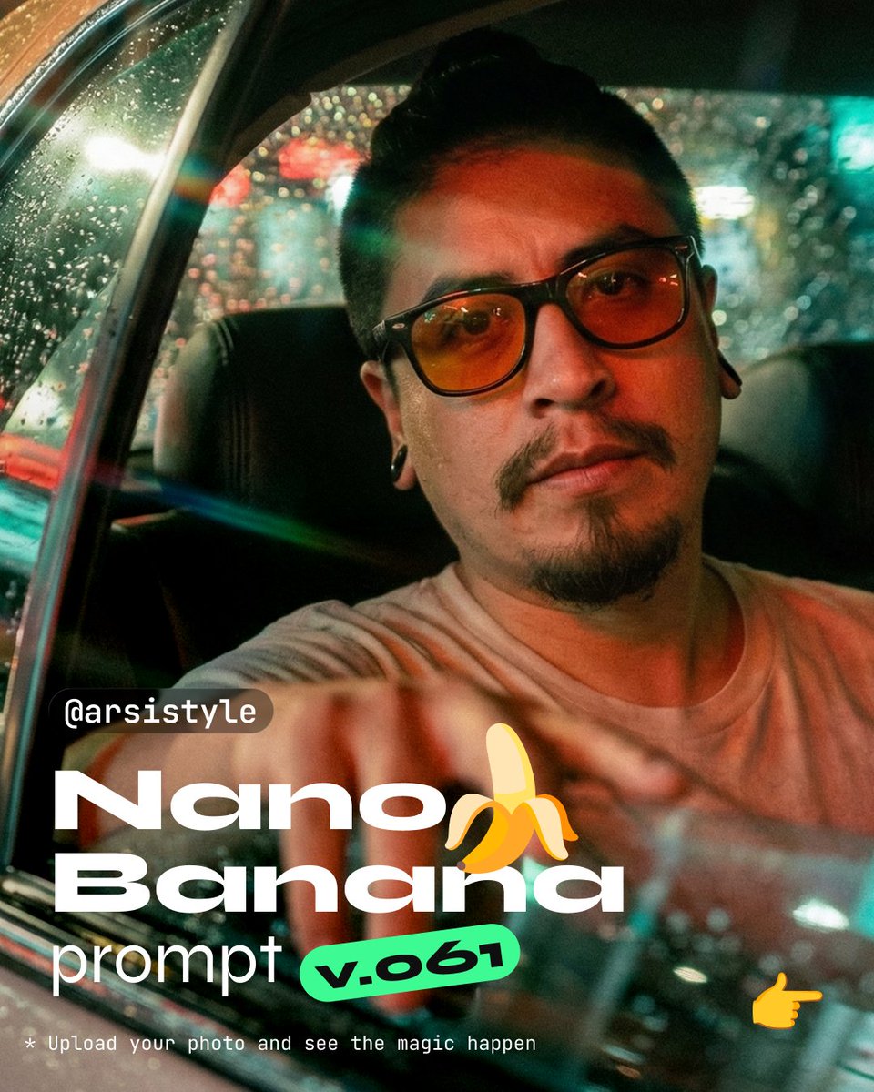 "Image from subject, medium close-up, shot from outside through a reflective car window. The subject is ({argument name="subject position" default="seated in the rear right passenger seat"}), leaning back against the headrest, looking directly toward the camera through the glass. A hand is visible resting on the interior window frame. Wearing a light-colored crew-neck t-shirt and dark-tinted round sunglasses. The setting is a taxi interior at night. The background is a blurred urban landscape with bright bokeh from traffic and neon signs. Rain droplets and condensation are present on the glass surface. Cinematic teal-and-orange color palette. Vibrant red and green neon reflections are projected onto the subject and the window glass. High-contrast lighting with deep, crushed shadows and warm, hazy highlights. Dense 35mm film grain, heavy glass reflections, lens flares, and soft chromatic aberration at the edges. "Related Nano Banana Pro Prompts
