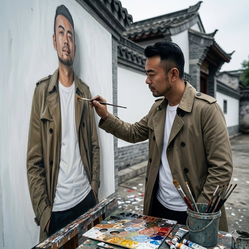 Subject & Action: A cinematic, painterly portrait of the man from the uploaded image, intensely focused as he paints a large-scale mural of himself. He holds a paintbrush, meticulously adding fine details to a life-sized self-portrait on a white wall. Both the artist and his mural counterpart are wearing identical outfits: a tan double-breasted trench coat over a white t-shirt. Environment & Details: In the lower foreground, a vibrant paint palette, various paint cans, and a bucket overflowing with brushes are visible. Artistic paint splatters mark the ground, showing the creative process. The background features a traditional building with clean white walls and elegant gray roof tiles. Lighting & Style: Cinematic editorial lighting with Rembrandt-inspired shadows that sculpt the face and body. A warm, golden key light balances with subtle fill, creating rich tonal depth and skin textures. Atmospheric and intimate mood, similar to a high-end Vanity Fair magazine cover. Fine-art warmth, soft gradients, and meticulously composed storytelling. --ar 1:1 --v 6.0