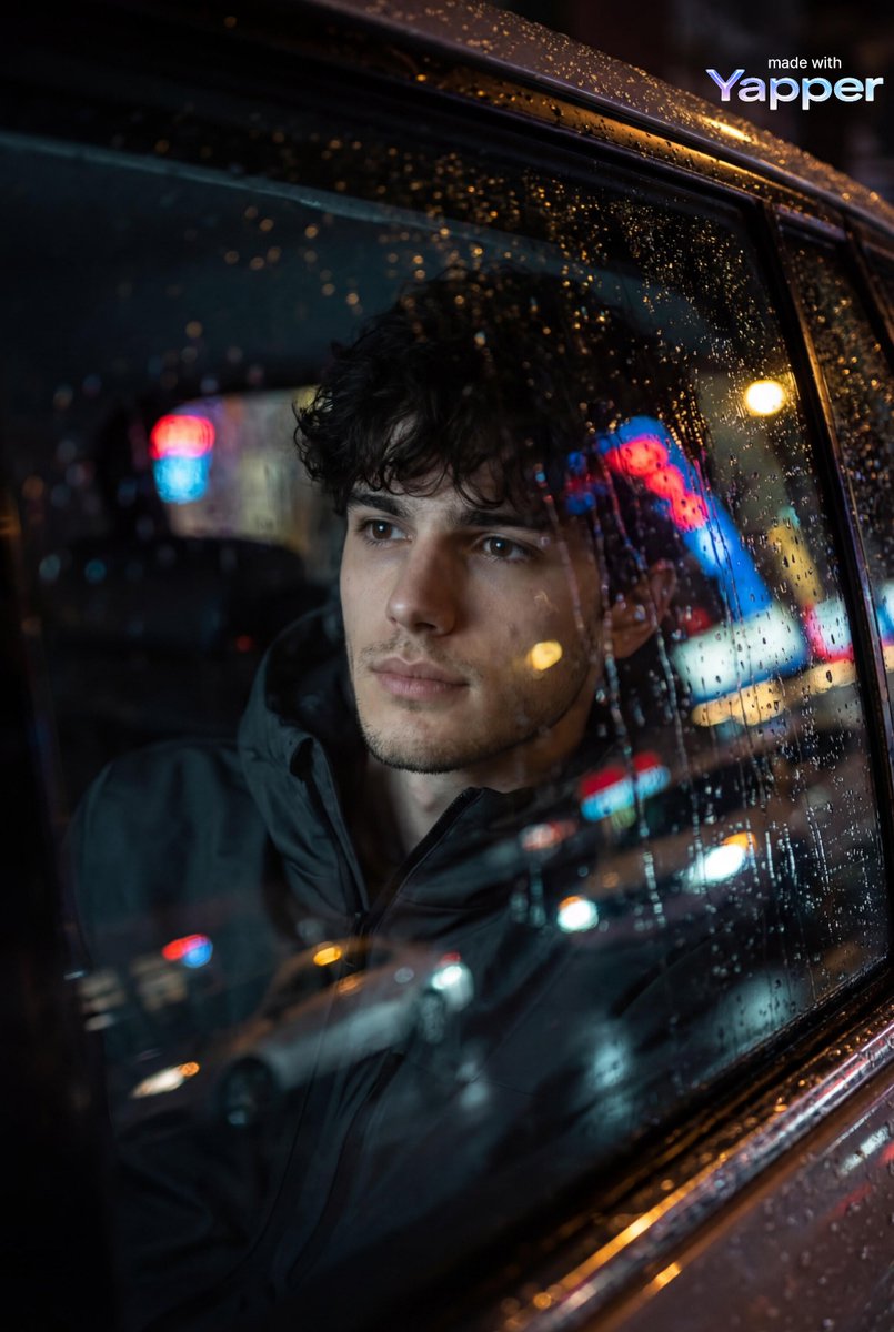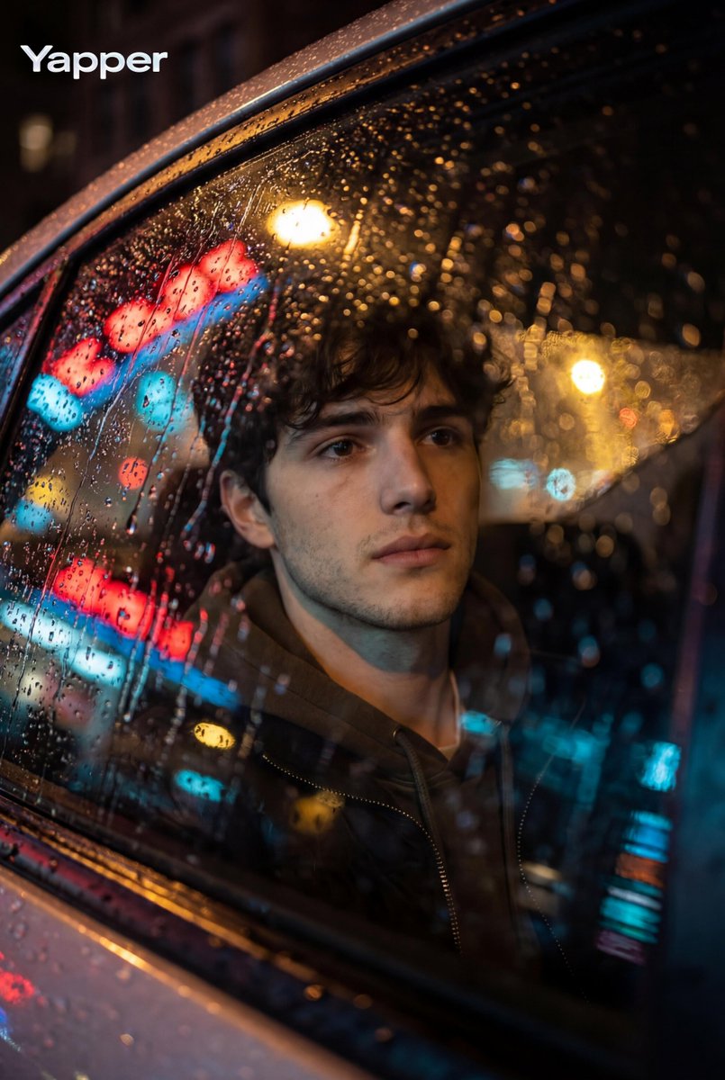 Create a highly cinematic and realistic photo of a person using the face from the uploaded image. The person is sitting inside a car at night, looking out through a rain-covered window. The camera is positioned outside the car, capturing the person through the wet glass. Raindrops and streaks of water are clearly visible on the window, with reflections of city lights, neon signs, and passing cars blending into the glass. The person’s face is softly lit by ambient street lights and subtle interior car lighting, creating a moody and emotional expression. The background outside is blurred with colorful bokeh lights (red, blue, yellow), giving a deep cinematic feel. The person is wearing a modern outfit like a hoodie or jacket. The mood feels introspective and film-like. Ultra realistic photography, shallow depth of field, dramatic lighting, reflections, rain texture, Hollywood movie scene composition, high detail.