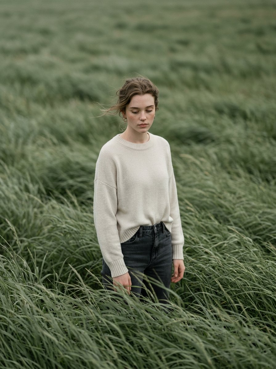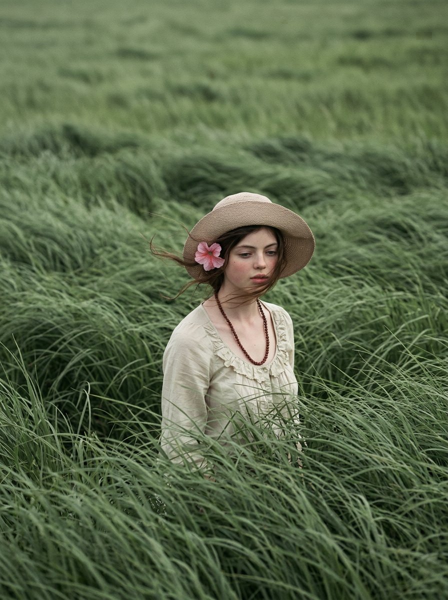 Create a cinematic editorial-style portrait in a 3:4 aspect ratio, with an atmospheric mood. Use the attached image as the exact reference for the subject’s face and identity, ensuring a perfect match. The subject (male or female) stands alone in the middle of a vast sage-green grass field, swept by strong winds. Tall grass surrounds the subject entirely, moving like ocean waves, partially obscuring the body and creating a sense of motion, depth, and isolation. The subject is wearing the exact same outfit as in the reference image. The hair appears slightly messy, naturally blown by the wind. The head is tilted slightly downward, with the gaze directed toward the ground, conveying a quiet, introspective, and melancholic mood. The facial expression is neutral, distant, and emotionally controlled. Compose the frame with the subject slightly off-center, using a slightly elevated camera angle. There should be no visible horizon only layers of grass filling the frame. Use muted natural tones such as sage green, deep olive green, and soft whites. Shoot in vertical 3:4 format using a telephoto lens with shallow depth of field. Frame the image in a cinematic style with a film photography aesthetic, including noticeable grain, soft edges, atmospheric lighting, and motion blur in the grass caused by wind. The overall tone should feel poetic, calm, and introspective, with high detail while maintaining a natural look. Magazine-cover quality, with no text or watermarks.