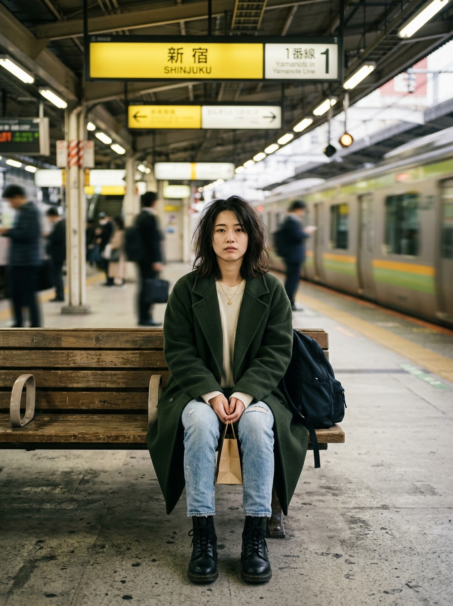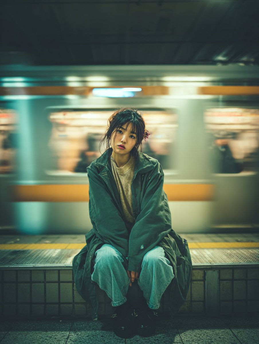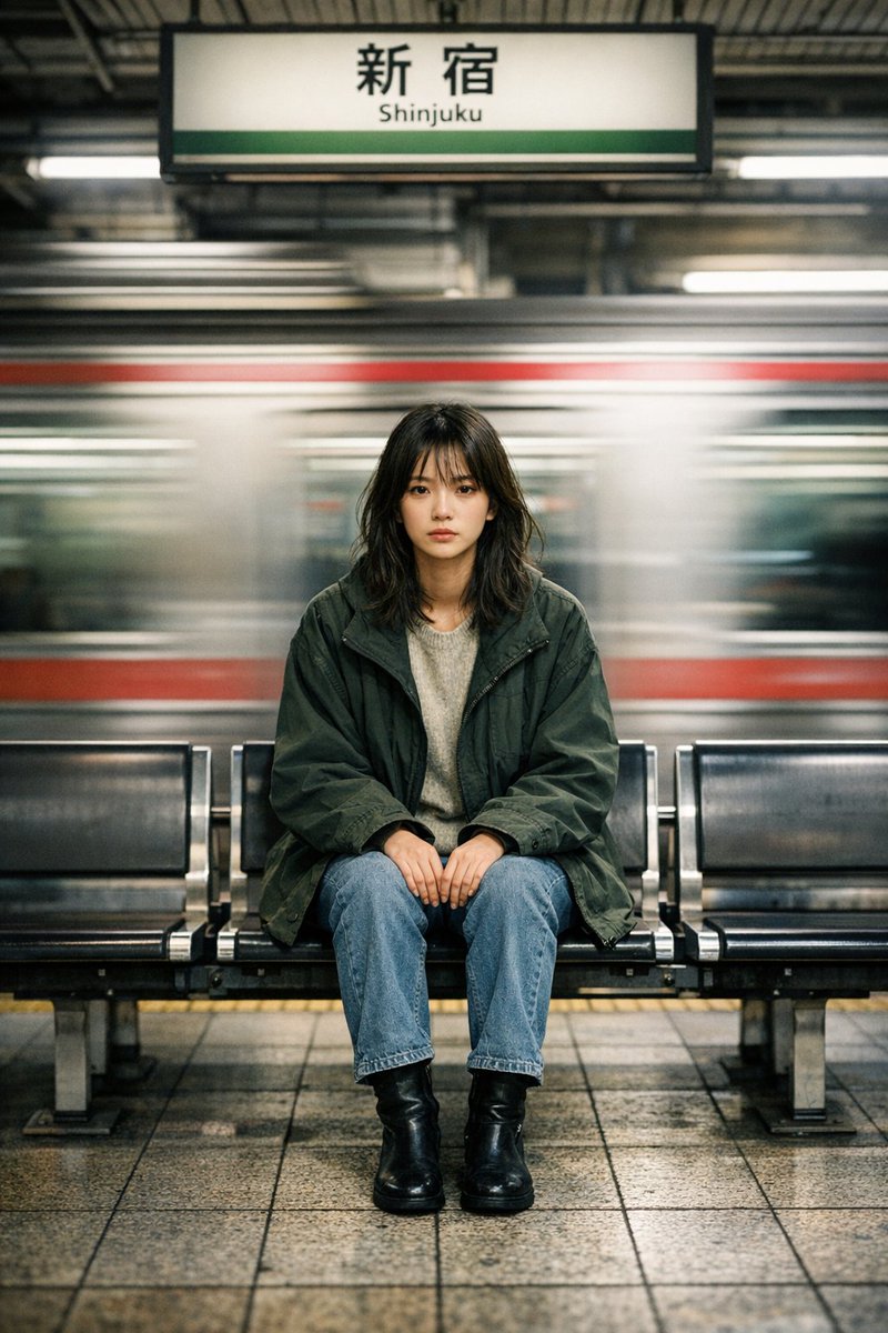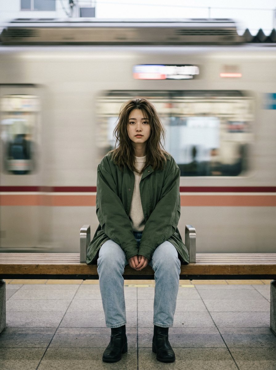 A cinematic portrait of a young Japanese woman sitting alone on a bench on the Shinjuku train platform, positioned in the center of the frame, looking straight at the camera with a calm and slightly serious expression. She is wearing an oversized dark green coat, a thin sweater, light blue jeans, and black boots. Her hair is loose and slightly messy. In the background, a subway train is speeding away, and strong motion blur is used to emphasize the contrast between the sense of speed and her still figure. Shallow depth of field, sharp focus on the subject, soft natural light, urban environment, calm color palette, high definition, professionally shot, 50mm lens, long exposure effect, symmetrical composition.