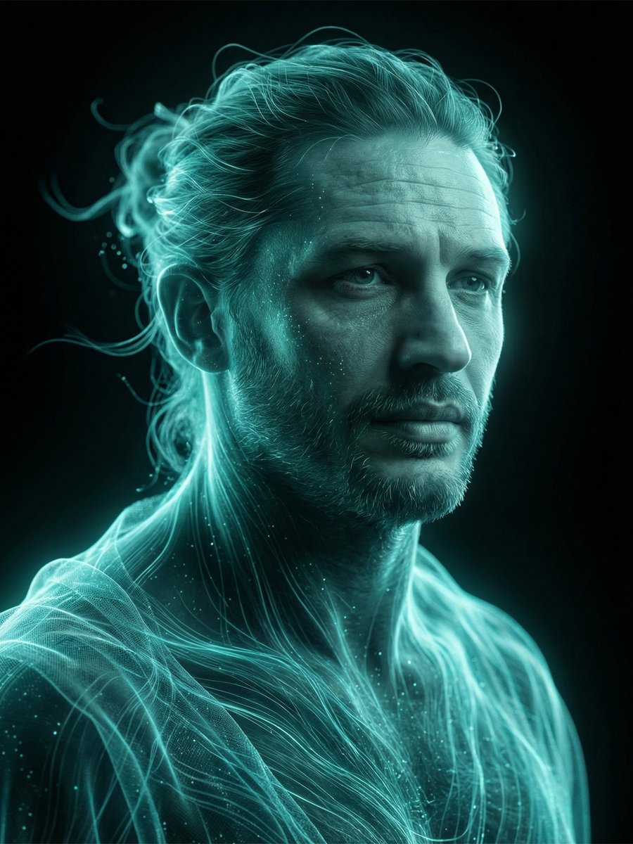 A cinematic portrait of an ethereal man formed from glowing teal and aqua energy strands, semi-transparent body made of flowing light and fine particles, soft melancholic expression, detailed realistic face, hair loosely tied with wisps floating in the air, futuristic spectral aura, delicate luminous fabric blending into energy threads, dark black background for strong contrast, dramatic side lighting, volumetric glow, ultra-detailed textures, fantasy sci-fi fusion, mystical atmosphere, hyper-realistic, 8K resolution, shallow depth of field, cinematic composition, soft rim light, high contrast, digital art masterpiece.