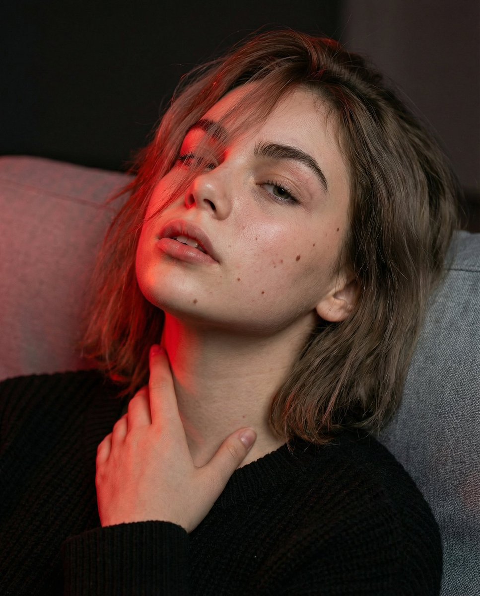 Ultra realistic cinematic close-up portrait using the uploaded reference image as the exact facial identity source Strict identity lock enabled - preserve the face 100% identical to the reference image (same facial structure jawline, cheekbones, lips, skin tone, proportions, and beautification, no stylization, no facial reshaping The subject is reclining slightly against a soft gray upholstered sunce doors Hee tilted back slightly, chin raised, exposing the neck naturally. One hand gently touching with relaxed fingers. Expression is calm, slightly intense, with relaxed parted lips and Lighting is dramatic and moods a strong red light source from the leit side castinga bold red flow across half of the face, while in soft neutral shadow Cinematic contrast Natural skin texture visible, no smoothing Hairis medium length, slightly messy with soft texture falling naturally across the corehead and parnau covering one eye Outit: black textured knit sweater with visible fabric detail.Background