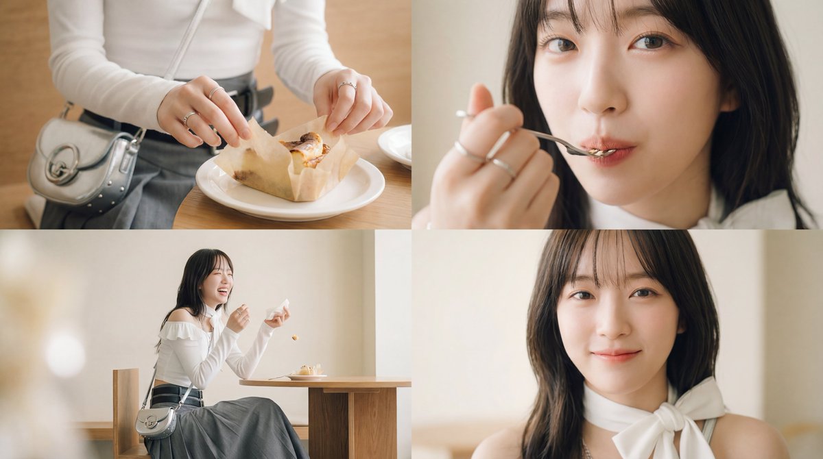 A cinematic short film in four cuts depicting the charm of a woman eating sweets. It uses warm color grading and shallow depth of field, prioritizing ASMR-like sound design. The composition seamlessly transitions from a close-up of hands opening the package, to a medium shot capturing delicate expressions and chewing sounds as she eats the sweets, including slow motion shots capturing scattering powder and textures, and finally to the satisfied afterglow of savoring the last bite. Expressing 'deliciousness' and 'happiness' through both visual and auditory means.