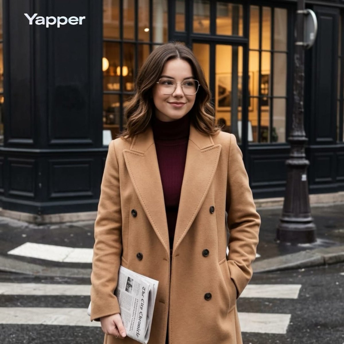 "pose": "standing at a pedestrian crossing with one hand in coat pocket and holding a folded newspaper in the other",