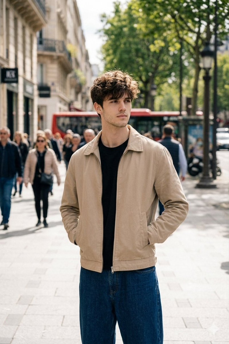 A highly realistic cinematic portrait of a young man standing outdoors during the daytime in a modern city street. Natural sunlight softly illuminates his face, creating gentle shadows and realistic skin texture with visible pores and fine details. He has slightly messy hair moving naturally in a light breeze and a calm confident expression while looking slightly away from the camera. He is wearing a casual modern outfit, a light jacket over a simple t shirt and dark jeans. The background shows a lively urban environment with buildings, trees, and people walking in the distance, softly blurred with shallow depth of field to keep focus on the subject. The sunlight creates warm highlights on his hair and shoulders, giving a natural golden tone to the scene. The composition feels like professional street photography taken with a DSLR camera using an 85mm lens. The colors are natural and balanced, with realistic contrast and cinematic color grading. Ultra photorealistic, cinematic lighting, high dynamic range, sharp focus on the eyes, natural skin tones, shallow depth of field, professional photography, 8k resolution, highly detailed, realistic daylight atmosphere.