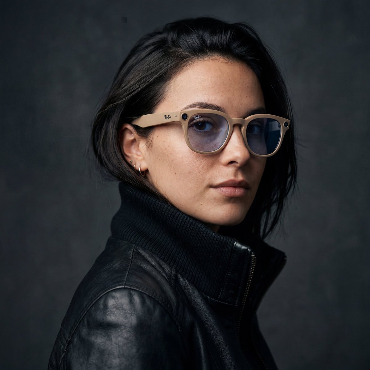 Cinematic studio portrait of a confident young woman wearing stylish beige framed smart glasses with subtle blue-tinted lenses, featuring a visible integrated camera lens on the outer corner and a Rayban logo on the temple and a black leather jacket with a high collar. She is slightly turned to the side, looking intensely toward the camera. Soft studio lighting with dramatic shadows, neutral grey background, fashion editorial style. Natural skin texture, sharp focus, shallow depth of field, high-end fashion photography, ultra-detailed, 85mm lens, professional studio lighting, moody atmosphere, photorealistic.